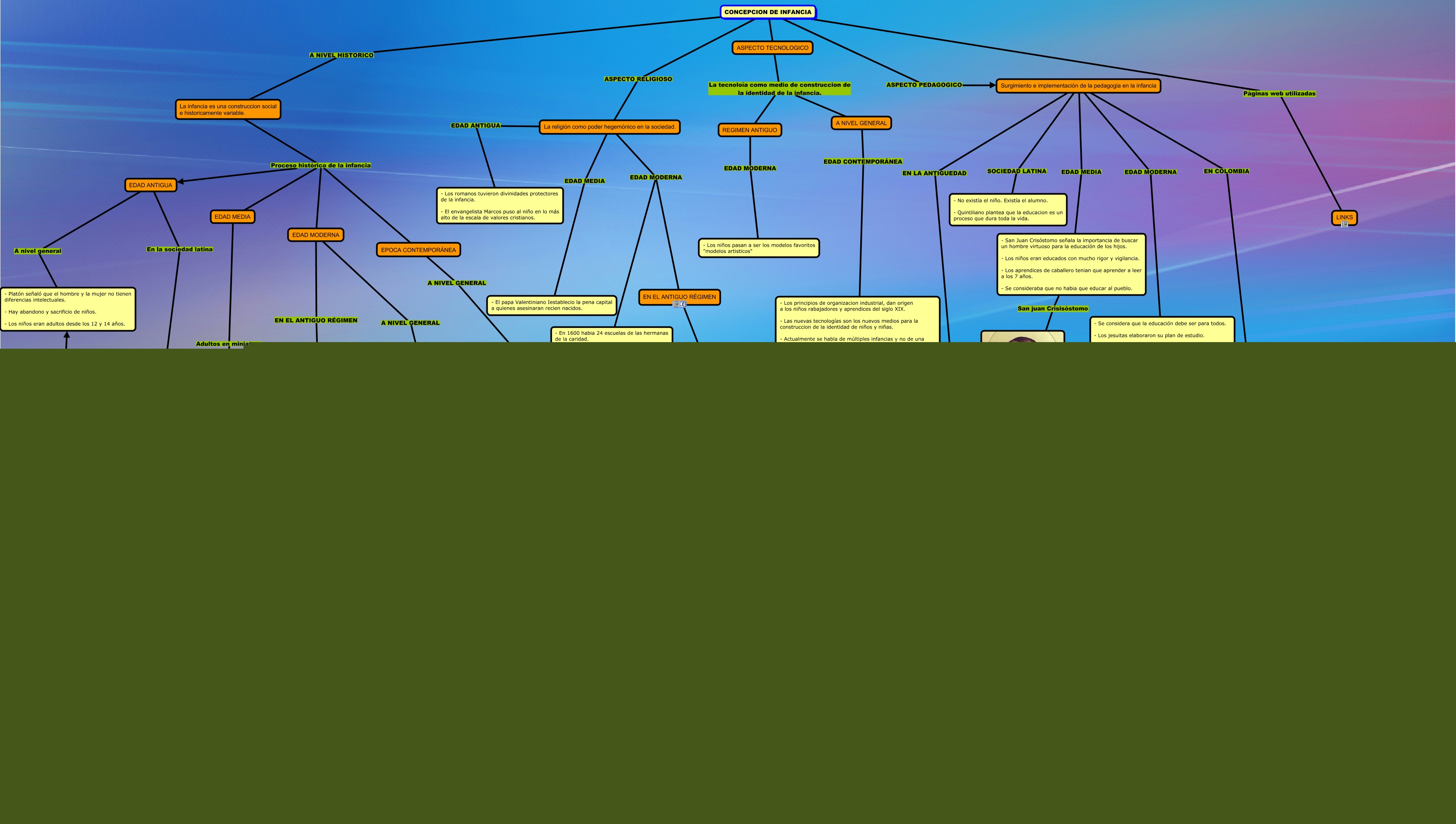 Este Cmap, tiene información relacionada con: CONCEPCIONES DE INFANCIA, - Heródoto, Platón, Jenofonte y Aristóteles, hacen observaciones sobre la educación de los principes persas. - En Esparta la educación estaba en manos del estado. - Platón se ocupó de las madres embarazadas y la educación inicial. Platón, Surgimiento e implementación de la pedagogia en la infancia EDAD MODERNA - Se considera que la educación debe ser para todos. - Los jesuitas elaboraron su plan de estudio. - Todas las pedagogias resaltan la importancia de la educación temprana. - Hay preocupación por la educación de la aristocracia. - Inicia la educacion de los niños más humildes. - Se inicia la pedagogía como ciencia académica., CONCEPCION DE INFANCIA ASPECTO PEDAGOGICO Surgimiento e implementación de la pedagogia en la infancia, EDAD ANTIGUA En la sociedad latina - El padre tenia derecho sobre la vida y muerte de los hijos., CONCEPCION DE INFANCIA ASPECTO RELIGIOSO La religión como poder hegemónico en la sociedad., EDAD ANTIGUA A nivel general - Platón señaló que el hombre y la mujer no tienen diferencias intelectuales. - Hay abandono y sacrificio de niños. - Los niños eran adultos desde los 12 y 14 años., - En la biblia se representan como adultos en miniatura. - El niño pasa a ser representado como un angel. -Se enfocaban mucho en la virgen María y su imagen de niña. Representacion infantil de la virgen María, La infancia es una construccion social e historicamente variable. Proceso histórico de la infancia EDAD MEDIA, EPOCA CONTEMPORÁNEA A NIVEL GENERAL - Muchos paises se preocupan por establecer leyes de proteccion a la infancia. - En 1959 las Naciones Unidas proclaman la declaracion de los derechos del niño. - Se reconoce al niño y a la niña como persona y ciudadano., La infancia es una construccion social e historicamente variable. Proceso histórico de la infancia EDAD ANTIGUA, Surgimiento e implementación de la pedagogia en la infancia SOCIEDAD LATINA - No existía el niño. Existía el alumno. - Quintiliano plantea que la educacion es un proceso que dura toda la vida., - San Juan Crisóstomo señala la importancia de buscar un hombre virtuoso para la educación de los hijos. - Los niños eran educados con mucho rigor y vigilancia. - Los aprendices de caballero tenian que aprender a leer a los 7 años. - Se consideraba que no habia que educar al pueblo. San juan Crisisóstomo, EN EL ANTIGUO RÉGIMEN Representacion - En la biblia se representan como adultos en miniatura. - El niño pasa a ser representado como un angel. -Se enfocaban mucho en la virgen María y su imagen de niña., REGIMEN ANTIGUO EDAD MODERNA - Los niños pasan a ser los modelos favoritos "modelos artisticos", CONCEPCION DE INFANCIA Páginas web utilizadas LINKS, La religión como poder hegemónico en la sociedad. EDAD MEDIA - El papa Valentiniano Iestablecio la pena capital a quienes asesinaran recien nacidos., Surgimiento e implementación de la pedagogia en la infancia EN COLOMBIA - Hacia 1870 se toma en cuenta a los niños para adecuar la enseñanza a sus condiciones, basandose en el método instruccionista de Pestalozzi. - En 1930 los principios de la escuela nueva, plantean que la base de la educación es la psicología. - En el siglo XX el cuidado de los niños mayores de 5 años se cede a los médicos, sacerdotes y profesores. - La educación se diferencia según la clase social. - El castigo tiene un lugar central en la educación. - En 1917, en el Ginmasio moderno se abre una seccion para niños de 3 a 5 años. - Se mantienen aún las diferencias de la educación según el género. - En 1939 llegan a Colombia los tests mentales para clasificar a los estudiantes. - La educación física aparece como prioridad del estado, que busca la salúd del pueblo. - Se establece el grado obligatorio de transición., - En la biblia se representan como adultos en miniatura. - El niño pasa a ser representado como un angel. -Se enfocaban mucho en la virgen María y su imagen de niña. Adultos miniatura, La religión como poder hegemónico en la sociedad. EDAD MODERNA - En 1600 habia 24 escuelas de las hermanas de la caridad., EDAD MODERNA A NIVEL GENERAL - Crece la preocupacion por la infancia , por la consideracion que obtienen los ciudadanos como sujetos con derechos. - Alta mortalidad y abandono masivo de niños en calles e iglesias. - Se busca mantener la inocencia de la infancia. - En 1670 se funda el hospital de niños abandonados. - Los niños y niñas abandonados eran incorporados al mundo laboral a los 10 años.