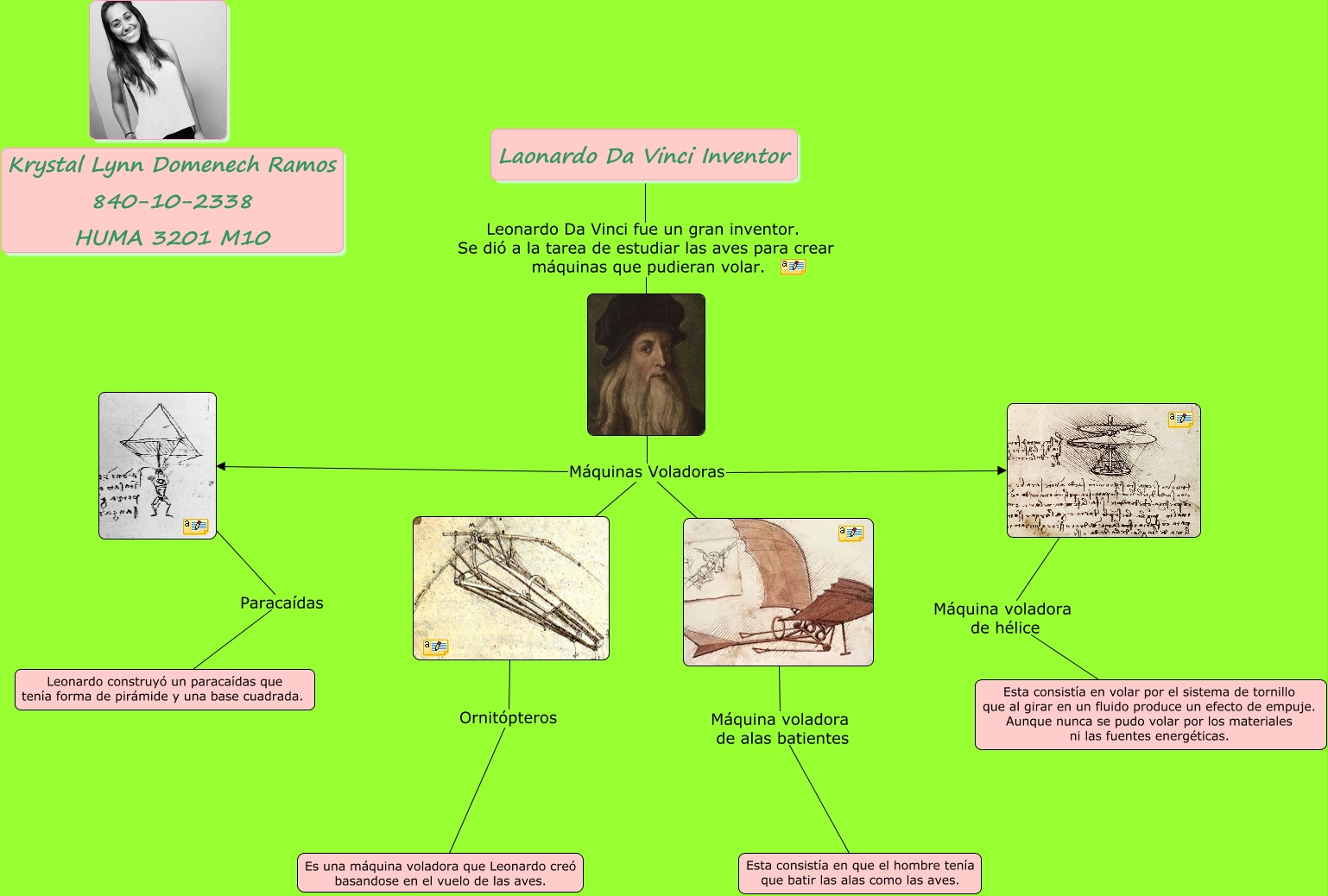 This Concept Map, created with IHMC CmapTools, has information related to: Máquinas Voladoras de Da Vinci, Máquinas Voladoras, Laonardo Da Vinci Inventor Leonardo Da Vinci fue un gran inventor. Se dió a la tarea de estudiar las aves para crear máquinas que pudieran volar., Ornitópteros Es una máquina voladora que Leonardo creó basandose en el vuelo de las aves., Máquinas Voladoras, Máquina voladora de alas batientes Esta consistía en que el hombre tenía que batir las alas como las aves., Máquinas Voladoras, Máquinas Voladoras, Paracaídas Leonardo construyó un paracaídas que tenía forma de pirámide y una base cuadrada., Máquina voladora de hélice Esta consistía en volar por el sistema de tornillo que al girar en un fluido produce un efecto de empuje. Aunque nunca se pudo volar por los materiales ni las fuentes energéticas.