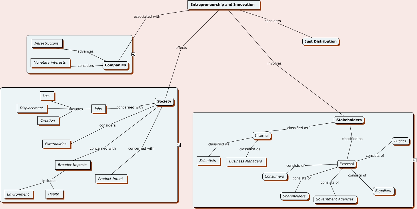 This Concept Map, created with IHMC CmapTools, has information related to: Promote Entrepreneurship and Innovation, Entrepreneurship and Innovation associated with Companies, Jobs includes Displacement, Society concerned with Product Intent, Society concerned with Jobs, Internal classified as Business Managers, Broader Impacts includes Environment, Society considers Externalities, Entrepreneurship and Innovation involves Stakeholders, Society concerned with Broader Impacts, External consists of Publics, External consists of Shareholders, Entrepreneurship and Innovation considers Just Distribution, Stakeholders classified as Internal, Broader Impacts includes Health, Jobs includes Loss, External consists of Consumers, External consists of Government Agencies, Stakeholders classified as External, Companies advances Infrastructure, Entrepreneurship and Innovation effects Society