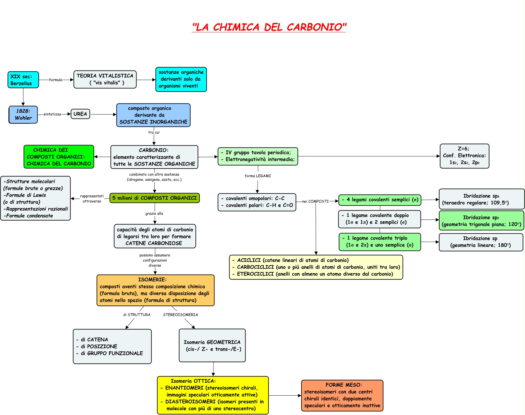 Questa Cmap, creata con IHMC CmapTools, contiene informazioni relative a: Caprarelli-Lepore-Chimica del Carbonio- Martina, 1828: Wohler sintetizza UREA, XIX sec: Berzelius formula TEORIA VITALISTICA ( "vis vitalis" ), - covalenti omopolari: C-C - covalenti polari: C-H e C=O nei COMPOSTI - 4 legami covalenti semplici (σ), capacità degli atomi di carbonio di legarsi tra loro per formare CATENE CARBONIOSE possono assumere configurazioni diverse ISOMERIE: composti aventi stessa composizione chimica (formula bruta), ma diversa disposizione degli atomi nello spazio (formula di struttura), - IV gruppo tavola periodica; - Elettronegatività intermedia; ???? Z=6; Conf. Elettronica: 1s2, 2s2, 2p2, - IV gruppo tavola periodica; - Elettronegatività intermedia; forma LEGAMI - covalenti omopolari: C-C - covalenti polari: C-H e C=O, UREA composto organico derivante da SOSTANZE INORGANICHE, - 1 legame covalente doppio (1σ e 1π) e 2 semplici (σ) ???? Ibridazione sp2 (geometria trigonale piana; 120°), CARBONIO: elemento caratterizzante di tutte le SOSTANZE ORGANICHE combinato con altre sostanze (idrogeno, ossigeno, azoto, ecc.) 5 milioni di COMPOSTI ORGANICI, CARBONIO: elemento caratterizzante di tutte le SOSTANZE ORGANICHE ???? - IV gruppo tavola periodica; - Elettronegatività intermedia;, 5 milioni di COMPOSTI ORGANICI grazie alla capacità degli atomi di carbonio di legarsi tra loro per formare CATENE CARBONIOSE, - 1 legame covalente triplo (1σ e 2π) e uno semplice (σ) ???? Ibridazione sp (geometria lineare; 180°), composto organico derivante da SOSTANZE INORGANICHE tra cui CARBONIO: elemento caratterizzante di tutte le SOSTANZE ORGANICHE, Isomeria OTTICA: - ENANTIOMERI (stereoisomeri chirali, immagini speculari otticamente attive) - DIASTEROISOMERI (isomeri presenti in molecole con più di uno stereocentro) ???? FORME MESO: stereoisomeri con due centri chirali identici, doppiamente speculari e otticamente inattive, - covalenti omopolari: C-C - covalenti polari: C-H e C=O nei COMPOSTI - ACICLICI (catene lineari di atomi di carbonio) - CARBOCICLICI (uno o più anelli di atomi di carbonio, uniti tra loro) - ETEROCICLICI (anelli con almeno un atomo diverso dal carbonio), - 4 legami covalenti semplici (σ) ???? ????, 5 milioni di COMPOSTI ORGANICI rappresentati attraverso -Strutture molecolari (formule brute o grezze) -Formule di Lewis (o di struttura) -Rappresentazioni razionali -Formule condensate, XIX sec: Berzelius ???? 1828: Wohler, CARBONIO: elemento caratterizzante di tutte le SOSTANZE ORGANICHE ???? CHIMICA DEI COMPOSTI ORGANICI: CHIMICA DEL CARBONIO, ISOMERIE: composti aventi stessa composizione chimica (formula bruta), ma diversa disposizione degli atomi nello spazio (formula di struttura) STEREOISOMERIA Isomeria GEOMETRICA (cis-/ Z- e trans-/E-)