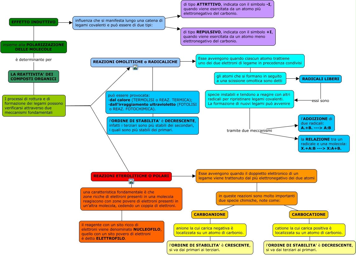 Questa Cmap, creata con IHMC CmapTools, contiene informazioni relative a: Migliorelli St-I meccanismi delle reazioni organiche-v2, Esse avvengono quando ciascun atomo trattiene uno dei due elettroni di legame in precedenza condivisi ???? gli atomi che si formano in seguito a una scissione omoltica sono detti, I processi di rottura e di formazione dei legami possono verificarsi attraverso due meccanismi fondamentali ???? REAZIONI OMOLITICHE o RADICALICHE, LA REATTIVITA' DEI COMPOSTI ORGANICI ???? I processi di rottura e di formazione dei legami possono verificarsi attraverso due meccanismi fondamentali, in queste reazioni sono molto importanti due specie chimiche, note come: ???? CARBOCATIONE, REAZIONI OMOLITICHE o RADICALICHE ???? Esse avvengono quando ciascun atomo trattiene uno dei due elettroni di legame in precedenza condivisi, specie instabili e tendono a reagire con altri radicali per ripristinare legami covalenti. La formazione di nuovi legami può avvenire tramite due meccanismi l'ADDIZIONE di due radicali: A.+B. ---> A:B, può essere provocata: -dal calore (TERMOLISI o REAZ. TERMICA); -dall'irraggiamento ultravioletto (FOTOLISI o REAZ. FOTOCHIMICA). ???? l'ORDINE DI STABILITA' è DECRESCENTE, infatti i terziari sono più stabili dei secondari, i quali sono più stabili dei primari., influenza che si manifesta lungo una catena di legami covalenti e può essere di due tipi: ???? di tipo REPULSIVO, indicata con il simbolo +I, quando viene esercitata da un atomo meno elettronegativo del carbonio., anione la cui carica negativa è localizzata su un atomo di carbonio. ???? l'ORDINE DI STABILITA' è CRESCENTE, si va dai primari ai terziari., insieme alla POLARIZZAZIONE DELLE MOLECOLE è determinante per LA REATTIVITA' DEI COMPOSTI ORGANICI, in queste reazioni sono molto importanti due specie chimiche, note come: ???? CARBOANIONE, una caratteristica fondamentale è che zone ricche di elettroni presenti in una molecola reagiscono con zone povere di elettroni presenti in un'altra molecola, cedendo un coppia di elettroni. ???? il reagente con un sito ricco di elettroni viene denominato NUCLEOFILO, quello con un sito povero di elettroni è detto ELETTROFILO., CARBOANIONE ???? anione la cui carica negativa è localizzata su un atomo di carbonio., I processi di rottura e di formazione dei legami possono verificarsi attraverso due meccanismi fondamentali ???? REAZIONI ETEROLITICHE O POLARI, CARBOCATIONE ???? catione la cui carica positiva è localizzata su un atomo di carbonio., EFFETTO INDUTTIVO ???? influenza che si manifesta lungo una catena di legami covalenti e può essere di due tipi:, specie instabili e tendono a reagire con altri radicali per ripristinare legami covalenti. La formazione di nuovi legami può avvenire tramite due meccanismi la RELAZIONE tra un radicale e una molecola: X.+A:B ---> X:A+B., REAZIONI ETEROLITICHE O POLARI ???? Esse avvengono quando il doppietto elettronico di un legame viene trattenuto dal più elettronegativo dei due atomi, EFFETTO INDUTTIVO ???? insieme alla POLARIZZAZIONE DELLE MOLECOLE, gli atomi che si formano in seguito a una scissione omoltica sono detti ???? RADICALI LIBERI
