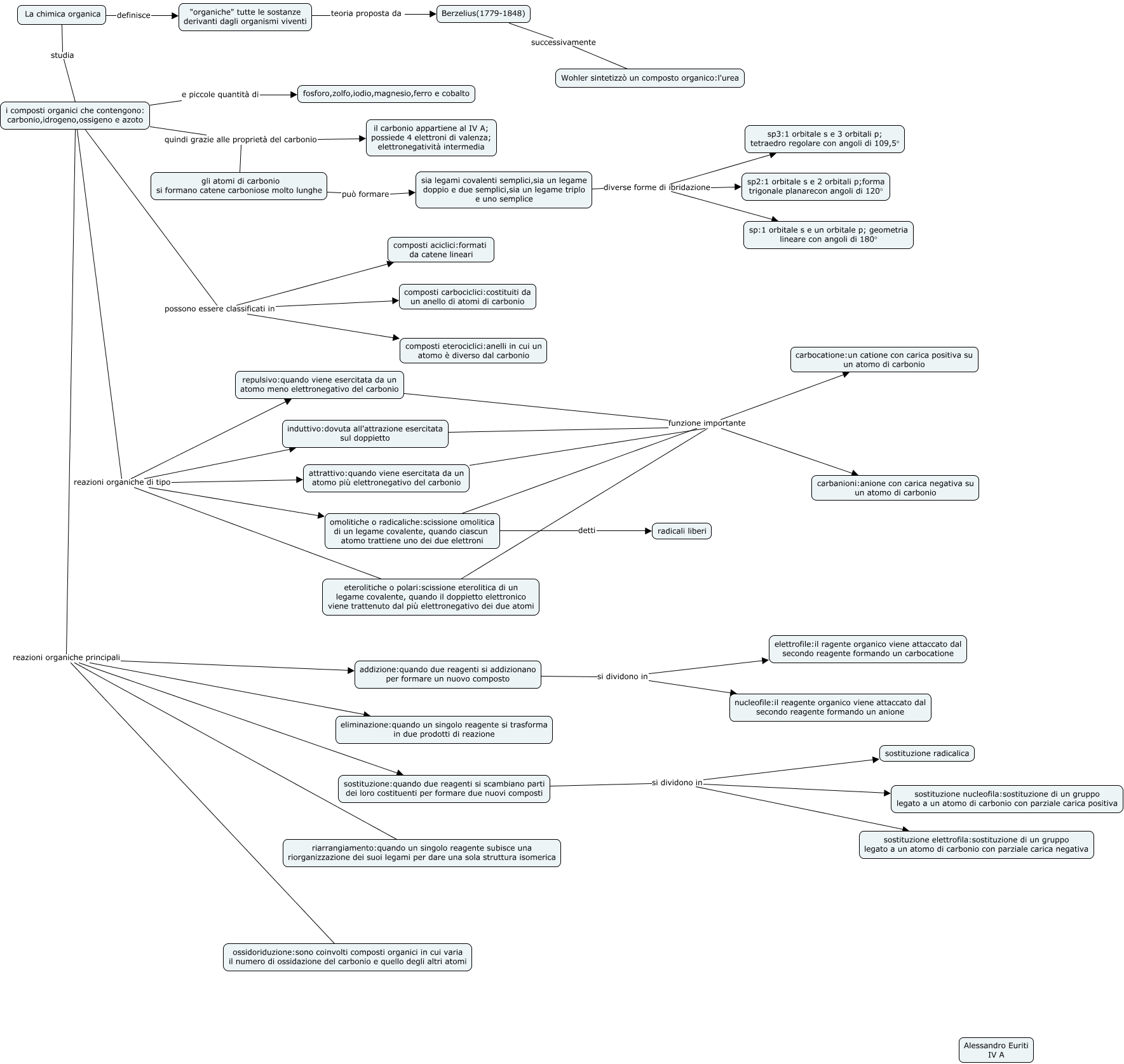 Questa Cmap, creata con IHMC CmapTools, contiene informazioni relative a: la chimica organica, induttivo:dovuta all'attrazione esercitata sul doppietto funzione importante carbocatione:un catione con carica positiva su un atomo di carbonio, Berzelius(1779-1848) successivamente Wohler sintetizzò un composto organico:l'urea, i composti organici che contengono: carbonio,idrogeno,ossigeno e azoto possono essere classificati in composti aciclici:formati da catene lineari, eterolitiche o polari:scissione eterolitica di un legame covalente, quando il doppietto elettronico viene trattenuto dal più elettronegativo dei due atomi funzione importante carbocatione:un catione con carica positiva su un atomo di carbonio, eterolitiche o polari:scissione eterolitica di un legame covalente, quando il doppietto elettronico viene trattenuto dal più elettronegativo dei due atomi funzione importante carbanioni:anione con carica negativa su un atomo di carbonio, induttivo:dovuta all'attrazione esercitata sul doppietto funzione importante carbanioni:anione con carica negativa su un atomo di carbonio, i composti organici che contengono: carbonio,idrogeno,ossigeno e azoto possono essere classificati in composti eterociclici:anelli in cui un atomo è diverso dal carbonio, i composti organici che contengono: carbonio,idrogeno,ossigeno e azoto e piccole quantità di fosforo,zolfo,iodio,magnesio,ferro e cobalto, i composti organici che contengono: carbonio,idrogeno,ossigeno e azoto reazioni organiche di tipo eterolitiche o polari:scissione eterolitica di un legame covalente, quando il doppietto elettronico viene trattenuto dal più elettronegativo dei due atomi, i composti organici che contengono: carbonio,idrogeno,ossigeno e azoto reazioni organiche di tipo repulsivo:quando viene esercitata da un atomo meno elettronegativo del carbonio, i composti organici che contengono: carbonio,idrogeno,ossigeno e azoto reazioni organiche principali ossidoriduzione:sono coinvolti composti organici in cui varia il numero di ossidazione del carbonio e quello degli altri atomi, La chimica organica studia i composti organici che contengono: carbonio,idrogeno,ossigeno e azoto, sia legami covalenti semplici,sia un legame doppio e due semplici,sia un legame triplo e uno semplice diverse forme di ibridazione sp3:1 orbitale s e 3 orbitali p; tetraedro regolare con angoli di 109,5°, addizione:quando due reagenti si addizionano per formare un nuovo composto si dividono in nucleofile:il reagente organico viene attaccato dal secondo reagente formando un anione, i composti organici che contengono: carbonio,idrogeno,ossigeno e azoto reazioni organiche principali addizione:quando due reagenti si addizionano per formare un nuovo composto, i composti organici che contengono: carbonio,idrogeno,ossigeno e azoto possono essere classificati in composti carbociclici:costituiti da un anello di atomi di carbonio, sia legami covalenti semplici,sia un legame doppio e due semplici,sia un legame triplo e uno semplice diverse forme di ibridazione sp:1 orbitale s e un orbitale p; geometria lineare con angoli di 180°, i composti organici che contengono: carbonio,idrogeno,ossigeno e azoto reazioni organiche principali riarrangiamento:quando un singolo reagente subisce una riorganizzazione dei suoi legami per dare una sola struttura isomerica, omolitiche o radicaliche:scissione omolitica di un legame covalente, quando ciascun atomo trattiene uno dei due elettroni detti radicali liberi, sostituzione:quando due reagenti si scambiano parti dei loro costituenti per formare due nuovi composti si dividono in sostituzione radicalica