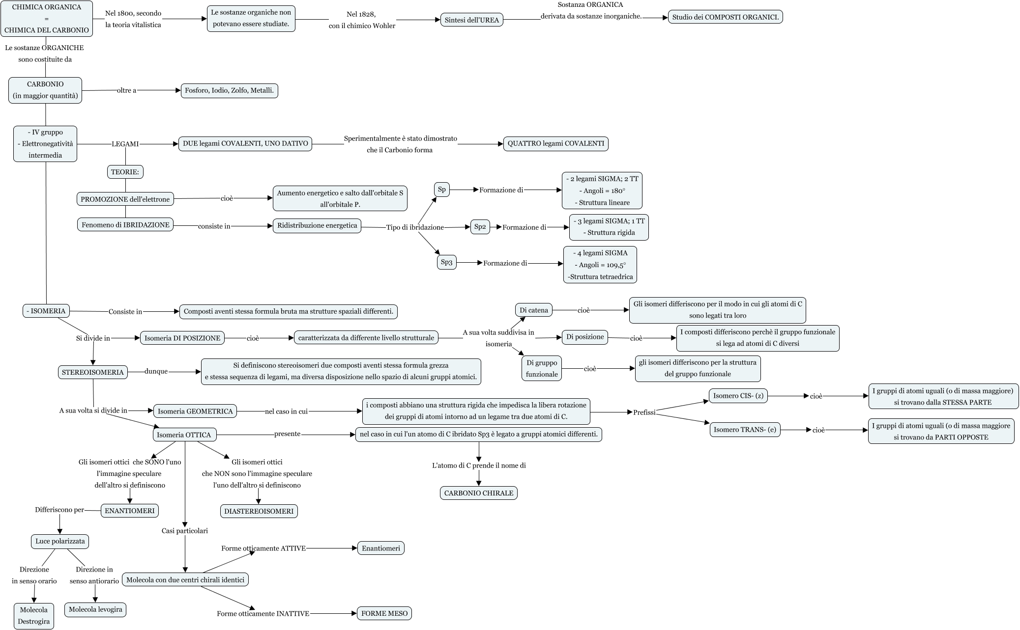 Questa Cmap, creata con IHMC CmapTools, contiene informazioni relative a: Moretti-Chimica organica!, i composti abbiano una struttura rigida che impedisca la libera rotazione dei gruppi di atomi intorno ad un legame tra due atomi di C. Prefissi Isomero TRANS- (e), Ridistribuzione energetica Tipo di ibridazione Sp, Luce polarizzata Direzione in senso orario Molecola Destrogira, - ISOMERIA Si divide in STEREOISOMERIA, Isomeria GEOMETRICA nel caso in cui i composti abbiano una struttura rigida che impedisca la libera rotazione dei gruppi di atomi intorno ad un legame tra due atomi di C., i composti abbiano una struttura rigida che impedisca la libera rotazione dei gruppi di atomi intorno ad un legame tra due atomi di C. Prefissi Isomero CIS- (z), caratterizzata da differente livello strutturale A sua volta suddivisa in isomeria Di catena, Sintesi dell'UREA Sostanza ORGANICA derivata da sostanze inorganiche. Studio dei COMPOSTI ORGANICI., Di posizione cioè I composti differiscono perchè il gruppo funzionale si lega ad atomi di C diversi, - ISOMERIA Consiste in Composti aventi stessa formula bruta ma strutture spaziali differenti., Isomeria OTTICA Casi particolari Molecola con due centri chirali identici, CHIMICA ORGANICA = CHIMICA DEL CARBONIO Le sostanze ORGANICHE sono costituite da - ISOMERIA, STEREOISOMERIA A sua volta si divide in Isomeria OTTICA, Molecola con due centri chirali identici Forme otticamente INATTIVE FORME MESO, PROMOZIONE dell'elettrone cioè Aumento energetico e salto dall'orbitale S all'orbitale P., - IV gruppo - Elettronegatività intermedia LEGAMI DUE legami COVALENTI, UNO DATIVO, STEREOISOMERIA A sua volta si divide in Isomeria GEOMETRICA, Fenomeno di IBRIDAZIONE consiste in Ridistribuzione energetica, Di catena cioè Gli isomeri differiscono per il modo in cui gli atomi di C sono legati tra loro, Isomero CIS- (z) cioè I gruppi di atomi uguali (o di massa maggiore) si trovano dalla STESSA PARTE