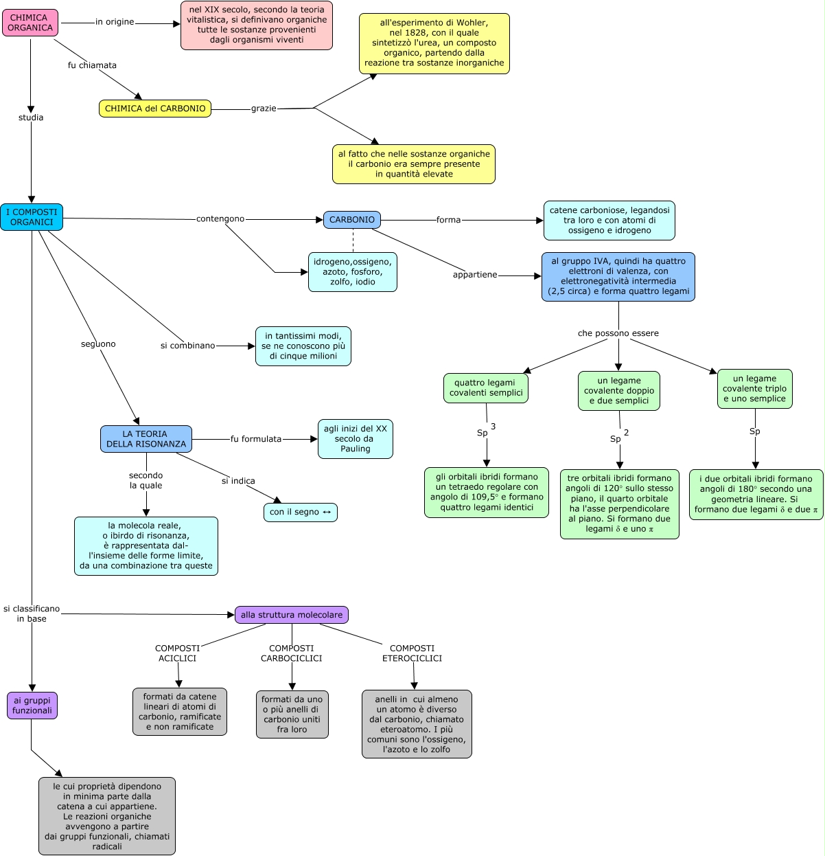 Questa Cmap, creata con IHMC CmapTools, contiene informazioni relative a: Quattrociocchi-Senza titolo 1, quattro legami covalenti semplici <math xmlns="http://www.w3.org/1998/Math/MathML"> <mrow> <mtext> Sp </mtext> <mmultiscripts> <mtext> </mtext> <none/> <mtext> 3 </mtext> </mmultiscripts> </mrow> </math> gli orbitali ibridi formano un tetraedo regolare con angolo di 109,5° e formano quattro legami identici, alla struttura molecolare COMPOSTI ACICLICI formati da catene lineari di atomi di carbonio, ramificate e non ramificate, CHIMICA ORGANICA studia I COMPOSTI ORGANICI, I COMPOSTI ORGANICI seguono LA TEORIA DELLA RISONANZA, CHIMICA ORGANICA fu chiamata CHIMICA del CARBONIO, CHIMICA del CARBONIO grazie all'esperimento di Wohler, nel 1828, con il quale sintetizzò l'urea, un composto organico, partendo dalla reazione tra sostanze inorganiche, un legame covalente triplo e uno semplice Sp i due orbitali ibridi formano angoli di 180° secondo una geometria lineare. Si formano due legami δ e due π, al gruppo IVA, quindi ha quattro elettroni di valenza, con elettronegatività intermedia (2,5 circa) e forma quattro legami che possono essere un legame covalente doppio e due semplici, alla struttura molecolare COMPOSTI CARBOCICLICI formati da uno o più anelli di carbonio uniti fra loro, al gruppo IVA, quindi ha quattro elettroni di valenza, con elettronegatività intermedia (2,5 circa) e forma quattro legami che possono essere un legame covalente triplo e uno semplice, I COMPOSTI ORGANICI si classificano in base alla struttura molecolare, alla struttura molecolare COMPOSTI ETEROCICLICI anelli in cui almeno un atomo è diverso dal carbonio, chiamato eteroatomo. I più comuni sono l'ossigeno, l'azoto e lo zolfo, CARBONIO appartiene al gruppo IVA, quindi ha quattro elettroni di valenza, con elettronegatività intermedia (2,5 circa) e forma quattro legami, ai gruppi funzionali ???? le cui proprietà dipendono in minima parte dalla catena a cui appartiene. Le reazioni organiche avvengono a partire dai gruppi funzionali, chiamati radicali, al gruppo IVA, quindi ha quattro elettroni di valenza, con elettronegatività intermedia (2,5 circa) e forma quattro legami che possono essere quattro legami covalenti semplici, un legame covalente doppio e due semplici <math xmlns="http://www.w3.org/1998/Math/MathML"> <mrow> <mtext> Sp </mtext> <mmultiscripts> <mtext> </mtext> <none/> <mtext> 2 </mtext> </mmultiscripts> </mrow> </math> tre orbitali ibridi formano angoli di 120° sullo stesso piano, il quarto orbitale ha l'asse perpendicolare al piano. Si formano due legami δ e uno π, I COMPOSTI ORGANICI contengono idrogeno,ossigeno, azoto, fosforo, zolfo, iodio, I COMPOSTI ORGANICI si combinano in tantissimi modi, se ne conoscono più di cinque milioni, LA TEORIA DELLA RISONANZA fu formulata agli inizi del XX secolo da Pauling, CARBONIO ???? idrogeno,ossigeno, azoto, fosforo, zolfo, iodio
