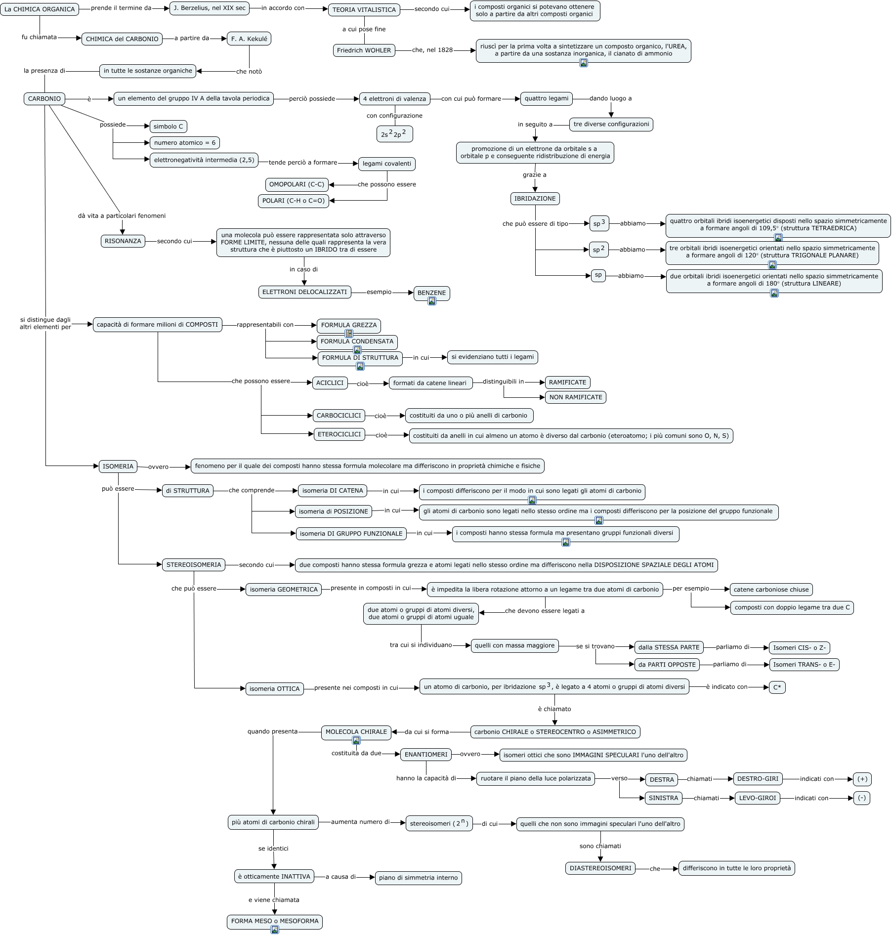 Questa Cmap, creata con IHMC CmapTools, contiene informazioni relative a: Franco-Caratteristiche generali del carbonio-v1, un elemento del gruppo IV A della tavola periodica perciò possiede 4 elettroni di valenza, capacità di formare milioni di COMPOSTI rappresentabili con FORMULA CONDENSATA, quelli con massa maggiore se si trovano dalla STESSA PARTE, J. Berzelius, nel XIX sec in accordo con TEORIA VITALISTICA, legami covalenti che possono essere OMOPOLARI (C-C), in tutte le sostanze organiche la presenza di CARBONIO, di STRUTTURA che comprende isomeria DI GRUPPO FUNZIONALE, IBRIDAZIONE che può essere di tipo <math xmlns="http://www.w3.org/1998/Math/MathML"> <mrow> <mmultiscripts> <mtext> sp </mtext> <none/> <mtext> 2 </mtext> </mmultiscripts> </mrow> </math>, formati da catene lineari distinguibili in RAMIFICATE, IBRIDAZIONE che può essere di tipo sp, MOLECOLA CHIRALE quando presenta più atomi di carbonio chirali, <math xmlns="http://www.w3.org/1998/Math/MathML"> <mrow> <mmultiscripts> <mtext> sp </mtext> <none/> <mtext> 2 </mtext> </mmultiscripts> </mrow> </math> abbiamo <math xmlns="http://www.w3.org/1998/Math/MathML"> <mtext> tre orbitali ibridi isoenergetici orientati nello spazio simmetricamente