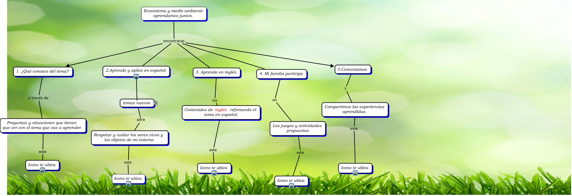 Este Cmap, tiene información relacionada con: ecosistemay medio ambiente, Ecosistema y medio ambiente aprendamos juntos. encontraras 2.Aprendo y aplico en español, Preguntas y situaciones que tienen que ver con el tema que vas a aprender. este Icono te ubica, Respetar y cuidar los seres vivos y los objetos de mi entorno este Icono te ubica, 4. Mi familia participa en Los juegos y actividades propuestas, 5.Comentamos y Compartimos las experiencias aprendidas., Los juegos y actividades propuestas este Icono te ubica, Contenidos de inglés reforzando el tema en español. este Icono te ubica, temas nuevos para Respetar y cuidar los seres vivos y los objetos de mi entorno, 3. Aprendo en inglés los Contenidos de inglés reforzando el tema en español., 2.Aprendo y aplico en español los Contenidos, Compartimos las experiencias aprendidas. este Icono te ubica, Ecosistema y medio ambiente aprendamos juntos. encontraras 5.Comentamos, Ecosistema y medio ambiente aprendamos juntos. encontraras 1. ¿Qué conozco del tema?, Ecosistema y medio ambiente aprendamos juntos. encontraras 3. Aprendo en inglés, Ecosistema y medio ambiente aprendamos juntos. encontraras 4. Mi familia participa, 1. ¿Qué conozco del tema? a través de Preguntas y situaciones que tienen que ver con el tema que vas a aprender.