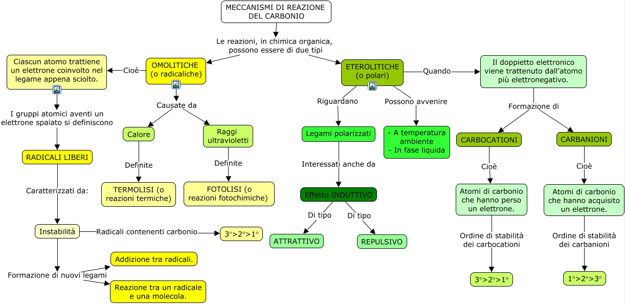Questa Cmap, creata con IHMC CmapTools, contiene informazioni relative a: Moretti-Reazioni-v2, ETEROLITICHE (o polari) Quando Il doppietto elettronico viene trattenuto dall'atomo più elettronegativo., RADICALI LIBERI Caratterizzati da: Instabilità, Il doppietto elettronico viene trattenuto dall'atomo più elettronegativo. Formazione di CARBOCATIONI, Instabilità Radicali contenenti carbonio 3°ɮ°ɭ°, Ciascun atomo trattiene un elettrone coinvolto nel legame appena sciolto. I gruppi atomici aventi un elettrone spaiato si definiscono RADICALI LIBERI, OMOLITICHE (o radicaliche) Causate da Calore, MECCANISMI DI REAZIONE DEL CARBONIO Le reazioni, in chimica organica, possono essere di due tipi OMOLITICHE (o radicaliche), ETEROLITICHE (o polari) Possono avvenire - A temperatura ambiente - In fase liquida, Calore Definite TERMOLISI (o reazioni termiche), Effetto INDUTTIVO Di tipo ATTRATTIVO, Raggi ultravioletti Definite FOTOLISI (o reazioni fotochimiche), Atomi di carbonio che hanno perso un elettrone. Ordine di stabilità dei carbocationi 3°ɮ°ɭ°, OMOLITICHE (o radicaliche) Causate da Raggi ultravioletti, Il doppietto elettronico viene trattenuto dall'atomo più elettronegativo. Formazione di CARBANIONI, MECCANISMI DI REAZIONE DEL CARBONIO Le reazioni, in chimica organica, possono essere di due tipi ETEROLITICHE (o polari), ETEROLITICHE (o polari) Riguardano Legami polarizzati, CARBOCATIONI Cioè Atomi di carbonio che hanno perso un elettrone., CARBANIONI Cioè Atomi di carbonio che hanno acquisito un elettrone., Legami polarizzati Interessati anche da Effetto INDUTTIVO, Effetto INDUTTIVO Di tipo REPULSIVO