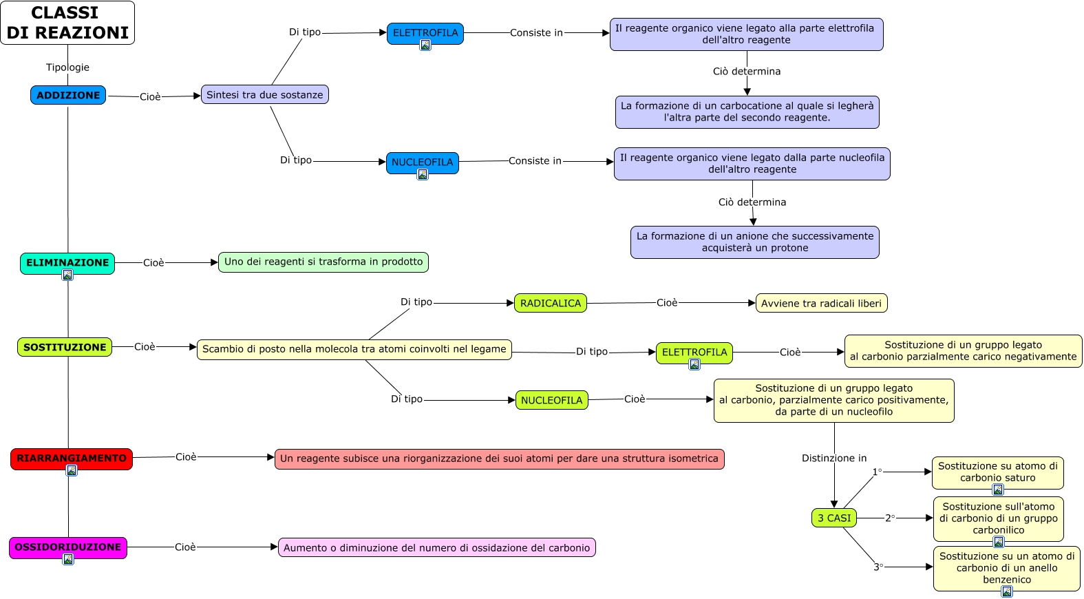 Questa Cmap, creata con IHMC CmapTools, contiene informazioni relative a: Moretti-Classi di reazioni-v2, ELETTROFILA Cioè Sostituzione di un gruppo legato al carbonio parzialmente carico negativamente, Il reagente organico viene legato alla parte elettrofila dell'altro reagente Ciò determina La formazione di un carbocatione al quale si legherà l'altra parte del secondo reagente., NUCLEOFILA Cioè Sostituzione di un gruppo legato al carbonio, parzialmente carico positivamente, da parte di un nucleofilo, SOSTITUZIONE Cioè Scambio di posto nella molecola tra atomi coinvolti nel legame, RIARRANGIAMENTO Cioè Un reagente subisce una riorganizzazione dei suoi atomi per dare una struttura isometrica, OSSIDORIDUZIONE Cioè Aumento o diminuzione del numero di ossidazione del carbonio, ELETTROFILA Consiste in Il reagente organico viene legato alla parte elettrofila dell'altro reagente, NUCLEOFILA Consiste in Il reagente organico viene legato dalla parte nucleofila dell'altro reagente, Scambio di posto nella molecola tra atomi coinvolti nel legame Di tipo RADICALICA, CLASSI DI REAZIONI Tipologie OSSIDORIDUZIONE, Scambio di posto nella molecola tra atomi coinvolti nel legame Di tipo ELETTROFILA, 3 CASI 2° Sostituzione sull'atomo di carbonio di un gruppo carbonilico, 3 CASI 1° Sostituzione su atomo di carbonio saturo, Sostituzione di un gruppo legato al carbonio, parzialmente carico positivamente, da parte di un nucleofilo Distinzione in 3 CASI, ADDIZIONE Cioè Sintesi tra due sostanze, Sintesi tra due sostanze Di tipo ELETTROFILA, Sintesi tra due sostanze Di tipo NUCLEOFILA, 3 CASI 3° Sostituzione su un atomo di carbonio di un anello benzenico, RADICALICA Cioè Avviene tra radicali liberi, Il reagente organico viene legato dalla parte nucleofila dell'altro reagente Ciò determina La formazione di un anione che successivamente acquisterà un protone