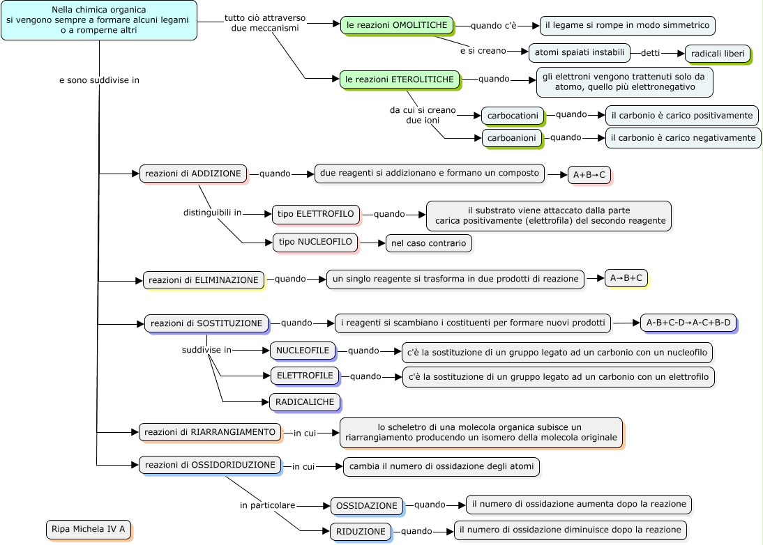 Questa Cmap, creata con IHMC CmapTools, contiene informazioni relative a: Ripa-reazioni, carbocationi quando il carbonio è carico positivamente, reazioni di SOSTITUZIONE suddivise in RADICALICHE, Nella chimica organica si vengono sempre a formare alcuni legami o a romperne altri e sono suddivise in reazioni di SOSTITUZIONE, carboanioni quando il carbonio è carico negativamente, Nella chimica organica si vengono sempre a formare alcuni legami o a romperne altri tutto ciò attraverso due meccanismi le reazioni ETEROLITICHE, NUCLEOFILE quando c'è la sostituzione di un gruppo legato ad un carbonio con un nucleofilo, tipo NUCLEOFILO ???? nel caso contrario, OSSIDAZIONE quando il numero di ossidazione aumenta dopo la reazione, atomi spaiati instabili detti radicali liberi, reazioni di ELIMINAZIONE quando un singlo reagente si trasforma in due prodotti di reazione, Nella chimica organica si vengono sempre a formare alcuni legami o a romperne altri e sono suddivise in reazioni di ELIMINAZIONE, le reazioni OMOLITICHE e si creano atomi spaiati instabili, reazioni di ADDIZIONE quando due reagenti si addizionano e formano un composto, Nella chimica organica si vengono sempre a formare alcuni legami o a romperne altri e sono suddivise in reazioni di OSSIDORIDUZIONE, un singlo reagente si trasforma in due prodotti di reazione ???? A→B+C, reazioni di SOSTITUZIONE quando i reagenti si scambiano i costituenti per formare nuovi prodotti, reazioni di OSSIDORIDUZIONE in particolare OSSIDAZIONE, due reagenti si addizionano e formano un composto ???? A+B→C, reazioni di OSSIDORIDUZIONE in cui cambia il numero di ossidazione degli atomi, Nella chimica organica si vengono sempre a formare alcuni legami o a romperne altri e sono suddivise in reazioni di ADDIZIONE