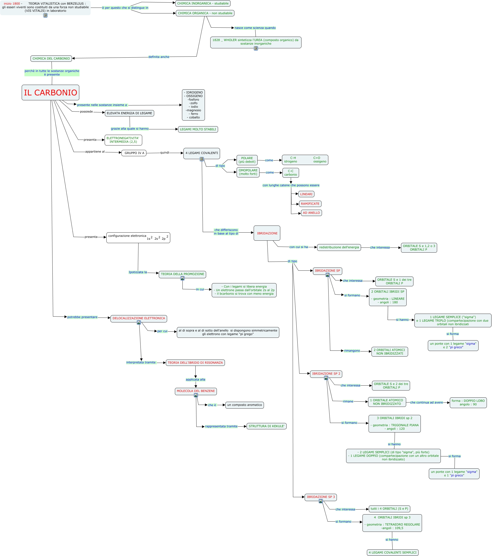 </mtext> <mmultiscripts> <mtext> 1s </mtext> <none/> <mtext> 2 </mtext> </mmultiscripts> <mtext> </mtext> <mmultiscripts> <mtext> 2s </mtext> <none/> <mtext> 2 </mtext> </mmultiscripts> <mtext> 2p </mtext> <mmultiscripts> <mtext> </mtext> <none/> <mtext> 2 </mtext> </mmultiscripts> </mrow> </math>, redistribuzione dell'energia che interessa ORBITALE S e 1,2 o 3 ORBITALI P, IBRIDAZIONE di tipo IBRIDAZIONE SP, IBRIDAZIONE SP 2 si formano 3 ORBITALI IBRIDI sp 2 - geometria : TRIGONALE PIANA - angoli : 120, IL CARBONIO presente nelle sostanze insieme a - IDROGENO - OSSIGENO -fosforo -zolfo - iodio -magnesio - ferro - cobalto, inizio 1800 - TEORIA VITALISTICA con BERZELIUS : gli esseri viventi sono costituiti da una forza non studiabile (VIS VITALIS) in laboratorio è per questo che si distingue in CHIMICA INORGANICA - studiabile, MOLECOLA DEL BENZENE che è un composto aromatico, POLARE (più deboli) come C-H C=O idrogeno ossigeno, TEORIA DELLA PROMOZIONE in cui - Con i legami si libera energia - Un elettrone passa dall'orbitale 2s al 2p - il bcarbonio si trova con meno energia, 4 ORBITALI IBRIDI sp 3 - geometria : TETRAEDRO REGOLARE -angoli : 109,5 si hanno 4 LEGAMI COVALENTI SEMPLICI, 1 ORBITALE ATOMICO NON IBRIDIZZATO che continua ad avere forma : DOPPIO LOBO angolo : 90, CHIMICA ORGANICA - non studiabile definita anche CHIMICA DEL CARBONIO, IBRIDAZIONE SP si formano 2 ORBITALI IBRIDI SP - geometria : LINEARE - angoli : 180, 3 ORBITALI IBRIDI sp 2 - geometria : TRIGONALE PIANA - angoli : 120 si hanno - 2 LEGAMI SEMPLICI (di tipo "sigma", più forte) - 1 LEGAME DOPPIO (compartecipazione con un altro orbitale non ibridizzato), IBRIDAZIONE SP 3 si formano 4 ORBITALI IBRIDI sp 3 - geometria : TETRAEDRO REGOLARE -angoli : 109,5, 4 LEGAMI COVALENTI che differiscono in base al tipo di IBRIDAZIONE