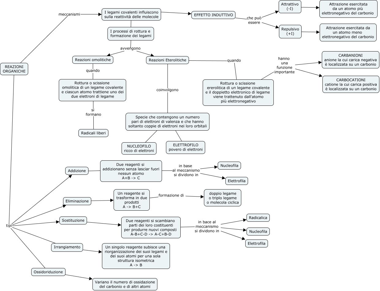Questa Cmap, creata con IHMC CmapTools, contiene informazioni relative a: Ripa-Meccanismi e tipi di reazioni organiche-v2, Rottura o scissione ererolitica di un legame covalente e il doppietto elettronico di legame viene trattenuto dall'atomo più elettronegativo hanno una funzione importante CARBOCATIONI catione la cui carica positiva è localizzata su un carbonio, Eliminazione ???? Un reagente si trasforma in due prodotti A -> B+C, REAZIONI ORGANICHE meccanismi I legami covalenti influiscono sulla reattività delle molecole, Due reagenti si addizionano senza lasciar fuori nessun atomo A+B -> C in base al meccanismo si dividono in Nucleofila, Specie che contengono un numero pari di elettroni di valenza e che hanno soltanto coppie di elettroni nei loro orbitali ???? ELETTROFILO povero di elettroni, Specie che contengono un numero pari di elettroni di valenza e che hanno soltanto coppie di elettroni nei loro orbitali ???? NUCLEOFILO ricco di elettroni, Attrattivo (-I) ???? Attrazione esercitata da un atomo più elettronegativo del carbonio, REAZIONI ORGANICHE tipi Addizione, Due reagenti si scambiano parti dei loro costituenti per produrre nuovi composti A-B+C-D -> A-C+B-D in bace al meccanismo si dividono in Elettrofila, Reazioni Eterolitiche coinvolgono Specie che contengono un numero pari di elettroni di valenza e che hanno soltanto coppie di elettroni nei loro orbitali, Un reagente si trasforma in due prodotti A -> B+C formazione di doppio legame o triplo legame o molecola ciclica, Due reagenti si scambiano parti dei loro costituenti per produrre nuovi composti A-B+C-D -> A-C+B-D in bace al meccanismo si dividono in Nucleofila, Due reagenti si addizionano senza lasciar fuori nessun atomo A+B -> C in base al meccanismo si dividono in Elettrofila, Repulsivo (+I) ???? Attrazione esercitata da un atomo meno elettronegativo del carbonio, Rottura o scissione ererolitica di un legame covalente e il doppietto elettronico di legame viene trattenuto dall'atomo più elettronegativo hanno una funzione importante CARBANIONI anione la cui carica negativa è localizzata su un carbonio, I processi di rottura e formazione dei legami avvengono Reazioni Eterolitiche, EFFETTO INDUTTIVO che può essere Attrattivo (-I), Reazioni omolitiche quando Rottura o scissione omolitica di un legame covalente e ciascun atomo trattiene uno dei due elettroni di legame, Due reagenti si scambiano parti dei loro costituenti per produrre nuovi composti A-B+C-D -> A-C+B-D in bace al meccanismo si dividono in Radicalica, Ossidoriduzione ???? Variano il numero di ossidazione del carbonio e di altri atomi
