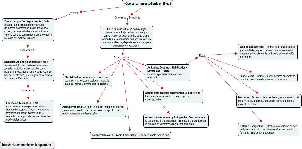 Este Cmap, tiene información relacionada con: Que es ser un estudiante en linea 2, En un entorno virtual ya no hay lugar para un aprendizaje pasivo, tendras que convertirte en un agente activo de tu propio aprendizaje, la educación en linea propicia un cambio substancial, dejar de ser alumnos para convertirse en estudiante. Caracteristicas Flexibilidad: Acceder a la infotmación en cualquier momento, en cualquier lugar, de cualquier forma y al ritmo que tu decidas., En un entorno virtual ya no hay lugar para un aprendizaje pasivo, tendras que convertirte en un agente activo de tu propio aprendizaje, la educación en linea propicia un cambio substancial, dejar de ser alumnos para convertirse en estudiante. Caracteristicas Actitudes, Destrezas, Habilidades y Estrategias Propias: Deberás aplicarlas para aprender a aprender, ¿Que es ser un estudiante en linea? De Alumno a Estudiante En un entorno virtual ya no hay lugar para un aprendizaje pasivo, tendras que convertirte en un agente activo de tu propio aprendizaje, la educación en linea propicia un cambio substancial, dejar de ser alumnos para convertirse en estudiante., En un entorno virtual ya no hay lugar para un aprendizaje pasivo, tendras que convertirte en un agente activo de tu propio aprendizaje, la educación en linea propicia un cambio substancial, dejar de ser alumnos para convertirse en estudiante. Caracteristicas Aprendizaje Autonomo y Autogestivo: Destrezas para la comunicación, la busqueda, la selección, la producción, la difusión de la información y el conocimiento., Educacion por Correspondencia (1840): Estaban conformados por un conjunto de materiales impresos distribuidos por el correo, se caracterizaba por ser unilateral y no se contaba con ninguna forma de apoyo mas allá del material impreso. Evolucionó a: Educación Abierta y a Distancia (1960): En este modelo el aprendizaje se basó en un paquete institucional que contaba con el material impreso, audiovisual y cada vez más material electrónico, que en general dependia de comunicación masiva., Actitudes, Destrezas, Habilidades y Estrategias Propias: Deberás aplicarlas para aprender a aprender Retos Destrezas: Ser autocritico y reflexivo, evita memorizar el conocimiento, analízalo, procesalo, apropiiate de el y proyecta tu saber, En un entorno virtual ya no hay lugar para un aprendizaje pasivo, tendras que convertirte en un agente activo de tu propio aprendizaje, la educación en linea propicia un cambio substancial, dejar de ser alumnos para convertirse en estudiante. Caracteristicas Actitud Para Trabajar en Entornos Colaborativos: Esto enriquese tu propio proceso cognitivo y de desarrollo., Actitudes, Destrezas, Habilidades y Estrategias Propias: Deberás aplicarlas para aprender a aprender Retos Aprendizaje Dirigido: Tendrás que ser autogestivo y autodidácta, tu propio aprendizaje y desempeño depende primordialmente de tí de tu administración del tiempo., Actitudes, Destrezas, Habilidades y Estrategias Propias: Deberás aplicarlas para aprender a aprender Retos Entorno Competitivo: El trabajo colaborativo no solo entiquece tu propio conocimiento, sino que tambien fortalece tu aprender a aprender., Educación Abierta y a Distancia (1960): En este modelo el aprendizaje se basó en un paquete institucional que contaba con el material impreso, audiovisual y cada vez más material electrónico, que en general dependia de comunicación masiva. Evolucionó a: Educación Telemática (1990): Abre una nueva perspectiva al estudio independiente, para ofrecer al estudiante mayor independencia a través de la interactividad soportada por los diferentes medios telemáticos., En un entorno virtual ya no hay lugar para un aprendizaje pasivo, tendras que convertirte en un agente activo de tu propio aprendizaje, la educación en linea propicia un cambio substancial, dejar de ser alumnos para convertirse en estudiante. Caracteristicas Actitud Proactiva: Se te da un amplio margen de libertad y autonomia para la toma de decisiones respecto a tu propio aprendizaje y desempeño., En un entorno virtual ya no hay lugar para un aprendizaje pasivo, tendras que convertirte en un agente activo de tu propio aprendizaje, la educación en linea propicia un cambio substancial, dejar de ser alumnos para convertirse en estudiante. Caracteristicas Compromiso con el Propio Aprendizaje: Debe ser durante toda la vida, ¿Que es ser un estudiante en linea? Historia Educacion por Correspondencia (1840): Estaban conformados por un conjunto de materiales impresos distribuidos por el correo, se caracterizaba por ser unilateral y no se contaba con ninguna forma de apoyo mas allá del material impreso., Actitudes, Destrezas, Habilidades y Estrategias Propias: Deberás aplicarlas para aprender a aprender Retos Fijarte Metas Propias: Buscar siempre alternativas de solución en caso de tener inconvenientes.