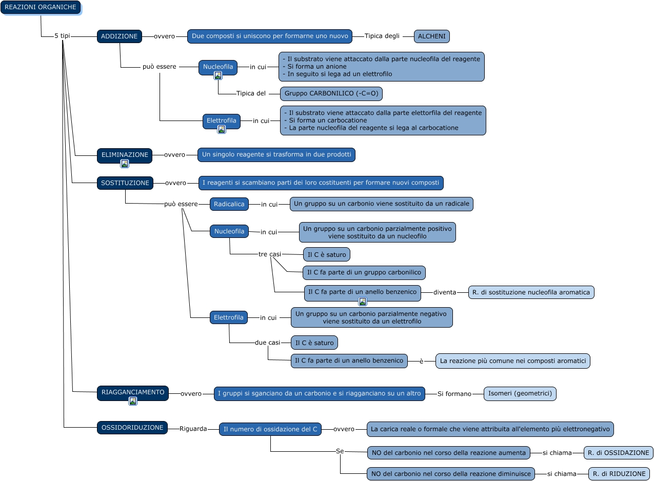 Questa Cmap, creata con IHMC CmapTools, contiene informazioni relative a: 1 - Tipi di reazione, I gruppi si sganciano da un carbonio e si riagganciano su un altro Si formano Isomeri (geometrici), REAZIONI ORGANICHE 5 tipi ELIMINAZIONE, OSSIDORIDUZIONE Riguarda Il numero di ossidazione del C, Nucleofila in cui - Il substrato viene attaccato dalla parte nucleofila del reagente - Si forma un anione - In seguito si lega ad un elettrofilo, NO del carbonio nel corso della reazione aumenta si chiama R. di OSSIDAZIONE, REAZIONI ORGANICHE 5 tipi RIAGGANCIAMENTO, Elettrofila due casi Il C è saturo, Due composti si uniscono per formarne uno nuovo Tipica degli ALCHENI, Il numero di ossidazione del C ovvero La carica reale o formale che viene attribuita all'elemento più elettronegativo, Il C fa parte di un anello benzenico diventa R. di sostituzione nucleofila aromatica, Elettrofila in cui - Il substrato viene attaccato dalla parte elettorfila del reagente - Si forma un carbocatione - La parte nucleofila del reagente si lega al carbocatione, SOSTITUZIONE può essere Elettrofila, Nucleofila tre casi Il C fa parte di un gruppo carbonilico, REAZIONI ORGANICHE 5 tipi ADDIZIONE, Nucleofila in cui Un gruppo su un carbonio parzialmente positivo viene sostituito da un nucleofilo, Il C fa parte di un anello benzenico è La reazione più comune nei composti aromatici, Elettrofila due casi Il C fa parte di un anello benzenico, SOSTITUZIONE può essere Radicalica, Il numero di ossidazione del C Se NO del carbonio nel corso della reazione diminuisce, SOSTITUZIONE ovvero I reagenti si scambiano parti dei loro costituenti per formare nuovi composti