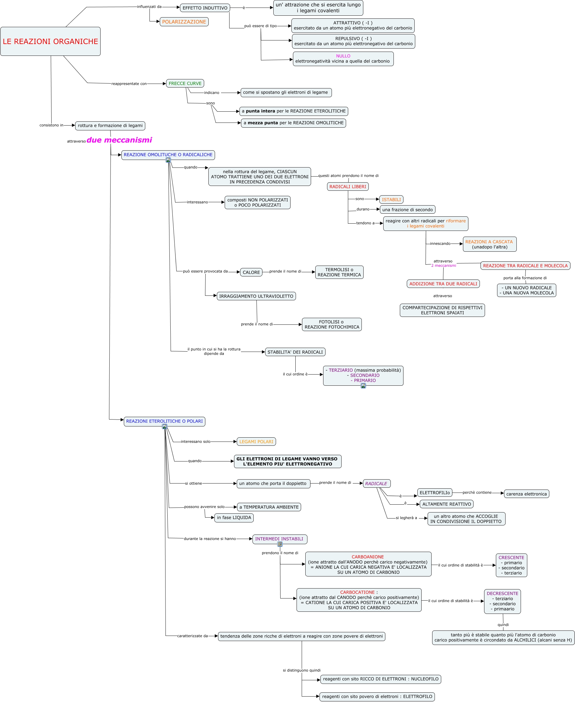 Questa Cmap, creata con IHMC CmapTools, contiene informazioni relative a: reazioni, INTERMEDI INSTABILI prendono il nome di CARBOANIONE (ione attratto dall'ANODO perchè carico negativamente) = ANIONE LA CUI CARICA NEGATIVA E' LOCALIZZATA SU UN ATOMO DI CARBONIO, RADICALI LIBERI tendono a reagire con altri radicali per riformare i legami covalenti, CARBOCATIONE : (ione attratto dal CANODO perchè carico positivamente) = CATIONE LA CUI CARICA POSITIVA E' LOCALIZZATA SU UN ATOMO DI CARBONIO il cui ordine di stabilità è DECRESCENTE - terziario - secondario - primaario, ADDIZIONE TRA DUE RADICALI attraverso COMPARTECIPAZIONE DI RISPETTIVI ELETTRONI SPAIATI, LE REAZIONI ORGANICHE consistono in rottura e formazione di legami, CARBOANIONE (ione attratto dall'ANODO perchè carico negativamente) = ANIONE LA CUI CARICA NEGATIVA E' LOCALIZZATA SU UN ATOMO DI CARBONIO il cui ordine di stabilità è CRESCENTE - primario - secondario - terziario, rottura e formazione di legami attraverso due meccanismi REAZIONE OMOLITUCHE O RADICALICHE, REAZIONI ETEROLITICHE O POLARI interessano solo LEGAMI POLARI, FRECCE CURVE indicano come si spostano gli elettroni di legame, IRRAGGIAMENTO ULTRAVIOLETTO prende il nome di FOTOLISI o REAZIONE FOTOCHIMICA, EFFETTO INDUTTIVO può essere di tipo ATTRATTIVO ( -I ) esercitato da un atomo più elettronegativo del carbonio, rottura e formazione di legami attraverso due meccanismi REAZIONI ETEROLITICHE O POLARI, REAZIONE OMOLITUCHE O RADICALICHE interessano composti NON POLARIZZATI o POCO POLARIZZATI, REAZIONI ETEROLITICHE O POLARI si ottiene un atomo che porta il doppietto, REAZIONI ETEROLITICHE O POLARI possono avvenire solo a TEMPERATURA AMBIENTE, REAZIONI ETEROLITICHE O POLARI durante la reazione si hanno INTERMEDI INSTABILI, EFFETTO INDUTTIVO può essere di tipo NULLO elettronegatività vicina a quella del carbonio, DECRESCENTE - terziario - secondario - primaario quindi tanto più è stabile quanto più l'atomo di carbonio carico positivamente è circondato da ALCHILICI (alcani senza H), REAZIONE TRA RADICALE E MOLECOLA porta alla formazione di - UN NUOVO RADICALE - UNA NUOVA MOLECOLA, tendenza delle zone ricche di elettroni a reagire con zone povere di elettroni si distinguono quindi reagenti con sito RICCO DI ELETTRONI : NUCLEOFILO