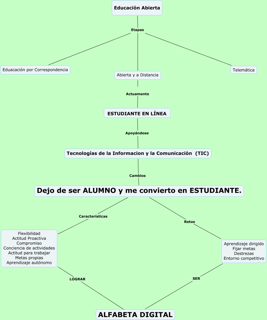 Este Cmap, tiene información relacionada con: Qué es un estudiante en línea, Aprendizaje dirigido Fijar metas Destrezas Entorno competitivo SER ALFABETA DIGITAL, Dejo de ser ALUMNO y me convierto en ESTUDIANTE. Retos Aprendizaje dirigido Fijar metas Destrezas Entorno competitivo, ESTUDIANTE EN LÍNEA Apoyándose Tecnologías de la Informacion y la Comunicación (TIC), Educación Abierta Etapas Abierta y a Distancia, Educación Abierta Etapas Eduacación por Correspondencia, Educación Abierta Etapas Telemática, Abierta y a Distancia Actuamente ESTUDIANTE EN LÍNEA, Flexibilidad Actitud Proactiva Compromiso Conciencia de actividades Actitud para trabajar Metas propias Aprendizaje autónomo LOGRAR ????, Tecnologías de la Informacion y la Comunicación (TIC) Cambios Dejo de ser ALUMNO y me convierto en ESTUDIANTE., Dejo de ser ALUMNO y me convierto en ESTUDIANTE. Características Flexibilidad Actitud Proactiva Compromiso Conciencia de actividades Actitud para trabajar Metas propias Aprendizaje autónomo