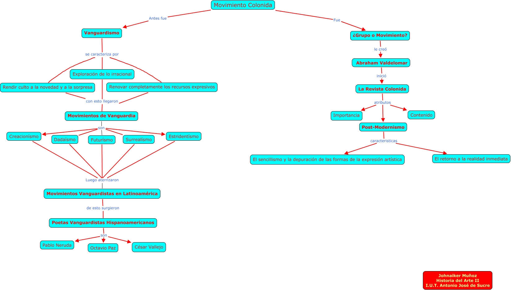 Este Cmap, tiene información relacionada con: Antecedentes del Movimiento Colonida, Movimiento Colonida Antes fue Vanguardismo, La Revista Colonida atributos Contenido, Abraham Valdelomar inició La Revista Colonida, Estridentísmo Luego aterrizaron Movimientos Vanguardistas en Latinoamérica, Poetas Vanguardistas Hispanoamericanos son Pablo Neruda, Vanguardismo se caracteriza por Renovar completamente los recursos expresivos, Post-Modernismo caracteristicas El sencillismo y la depuración de las formas de la expresión artística, Movimientos de Vanguardia son Creacionísmo, Rendir culto a la novedad y a la sorpresa con esto llegaron Movimientos de Vanguardia, Vanguardismo se caracteriza por Exploración de lo irracional, Surrealísmo Luego aterrizaron Movimientos Vanguardistas en Latinoamérica, Movimientos de Vanguardia son Estridentísmo, Futurísmo Luego aterrizaron Movimientos Vanguardistas en Latinoamérica, Movimiento Colonida Fue ¿Grupo o Movimiento?, ¿Grupo o Movimiento? le creó Abraham Valdelomar, Movimientos de Vanguardia son Surrealísmo, Movimientos de Vanguardia son Dadaísmo, Poetas Vanguardistas Hispanoamericanos son César Vallejo, Post-Modernismo caracteristicas El retorno a la realidad inmediata, Creacionísmo Luego aterrizaron Movimientos Vanguardistas en Latinoamérica