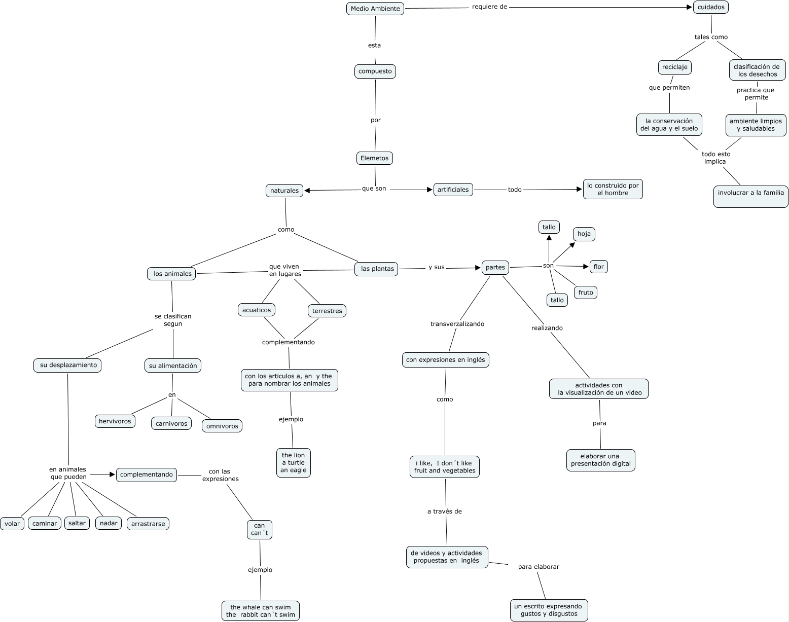 Este Cmap, tiene información relacionada con: medio ambiente mapa5, su alimentación en omnivoros, las plantas y sus partes, Medio Ambiente esta compuesto, su alimentación en hervivoros, su desplazamiento en animales que pueden complementando, actividades con la visualización de un video para elaborar una presentación digital, can can´t ejemplo the whale can swim the rabbit can´t swim, Medio Ambiente requiere de cuidados, con los articulos a, an y the para nombrar los animales ejemplo the lion a turtle an eagle, con expresiones en inglés como i like, I don´t like fruit and vegetables, acuaticos complementando con los articulos a, an y the para nombrar los animales, cuidados tales como clasificación de los desechos, clasificación de los desechos practica que permite ambiente limpios y saludables, complementando con las expresiones can can´t, partes son flor, de videos y actividades propuestas en inglés para elaborar un escrito expresando gustos y disgustos, Elemetos que son artificiales, i like, I don´t like fruit and vegetables a través de de videos y actividades propuestas en inglés, su desplazamiento en animales que pueden nadar, los animales que viven en lugares terrestres