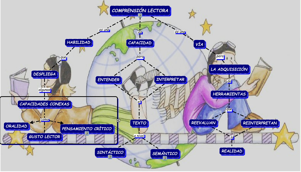 Este Cmap, tiene información relacionada con: Comprensión Lectora_ET, HERRAMIENTAS que REINTERPRETAN, CAPACIDAD para ENTENDER, CAPACIDADES CONEXAS como ORALIDAD, ENTENDER el TEXTO, VÍA para LA ADQUISICIÓN, TEXTO a nivel SINTÁCTICO, COMPRENSIÓN LECTORA es una VÍA, CAPACIDAD para INTERPRETAR, HABILIDAD que DESPLIEGA, REEVALUAN la REALIDAD, HERRAMIENTAS que REEVALUAN, COMPRENSIÓN LECTORA es una HABILIDAD, TEXTO a nivel SEMÁNTICO, INTERPRETAR el TEXTO, LA ADQUISICIÓN de HERRAMIENTAS, REINTERPRETAN la REALIDAD, CAPACIDADES CONEXAS como PENSAMIENTO CRÍTICO, COMPRENSIÓN LECTORA es CAPACIDAD, DESPLIEGA algunas CAPACIDADES CONEXAS, CAPACIDADES CONEXAS como GUSTO LECTOR