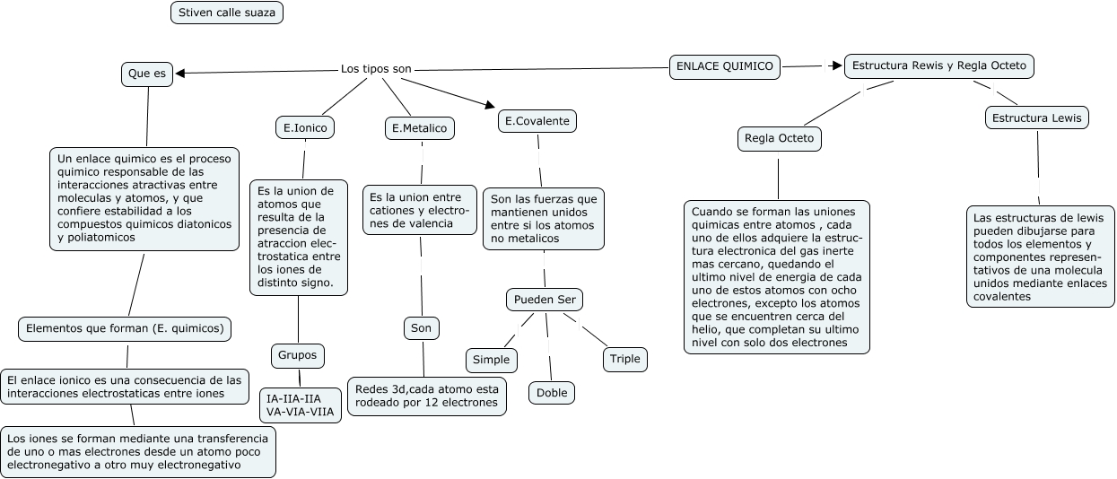 Este Cmap, tiene información relacionada con: stiven calle 103, ENLACE QUIMICO Los tipos son E.Ionico, E.Metalico Es la union entre cationes y electro- nes de valencia, ENLACE QUIMICO Estructura Rewis y Regla Octeto, Estructura Rewis y Regla Octeto Estructura Lewis, Pueden Ser Simple, IA-IIA-IIA VA-VIA-VIIA Grupos, Estructura Rewis y Regla Octeto Regla Octeto, ENLACE QUIMICO Los tipos son Que es, Un enlace quimico es el proceso quimico responsable de las interacciones atractivas entre moleculas y atomos, y que confiere estabilidad a los compuestos quimicos diatonicos y poliatomicos Elementos que forman (E. quimicos), Regla Octeto Cuando se forman las uniones quimicas entre atomos , cada uno de ellos adquiere la estruc- tura electronica del gas inerte mas cercano, quedando el ultimo nivel de energia de cada uno de estos atomos con ocho electrones, excepto los atomos que se encuentren cerca del helio, que completan su ultimo nivel con solo dos electrones, IA-IIA-IIA VA-VIA-VIIA Grupos, Es la union de atomos que resulta de la presencia de atraccion elec- trostatica entre los iones de distinto signo. ???? Grupos, E.Ionico Es la union de atomos que resulta de la presencia de atraccion elec- trostatica entre los iones de distinto signo., Es la union entre cationes y electro- nes de valencia Son, Son Redes 3d,cada atomo esta rodeado por 12 electrones, Pueden Ser Triple, ENLACE QUIMICO Los tipos son E.Metalico, Son las fuerzas que mantienen unidos entre si los atomos no metalicos Pueden Ser, Elementos que forman (E. quimicos) El enlace ionico es una consecuencia de las interacciones electrostaticas entre iones, Grupos IA-IIA-IIA VA-VIA-VIIA