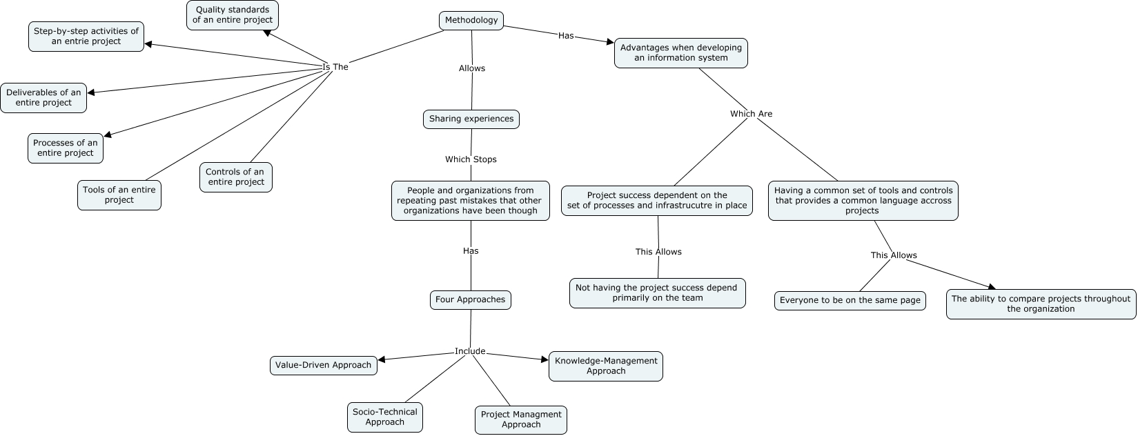 This Concept Map, created with IHMC CmapTools, has information related to: Methodology, Four Approaches Include Project Managment Approach, Methodology Is The Controls of an entire project, Four Approaches Include Value-Driven Approach, Methodology Is The Step-by-step activities of an entrie project, Having a common set of tools and controls that provides a common language accross projects This Allows The ability to compare projects throughout the organization, Four Approaches Include Knowledge-Management Approach, Having a common set of tools and controls that provides a common language accross projects This Allows Everyone to be on the same page, Methodology Is The Processes of an entire project, Advantages when developing an information system Which Are Project success dependent on the set of processes and infrastrucutre in place, People and organizations from repeating past mistakes that other organizations have been though Has Four Approaches, Methodology Has Advantages when developing an information system, Four Approaches Include Socio-Technical Approach, Methodology Allows Sharing experiences, Advantages when developing an information system Which Are Having a common set of tools and controls that provides a common language accross projects, Sharing experiences Which Stops People and organizations from repeating past mistakes that other organizations have been though, Methodology Is The Tools of an entire project, Project success dependent on the set of processes and infrastrucutre in place This Allows Not having the project success depend primarily on the team, Methodology Is The Deliverables of an entire project, Methodology Is The Quality standards of an entire project