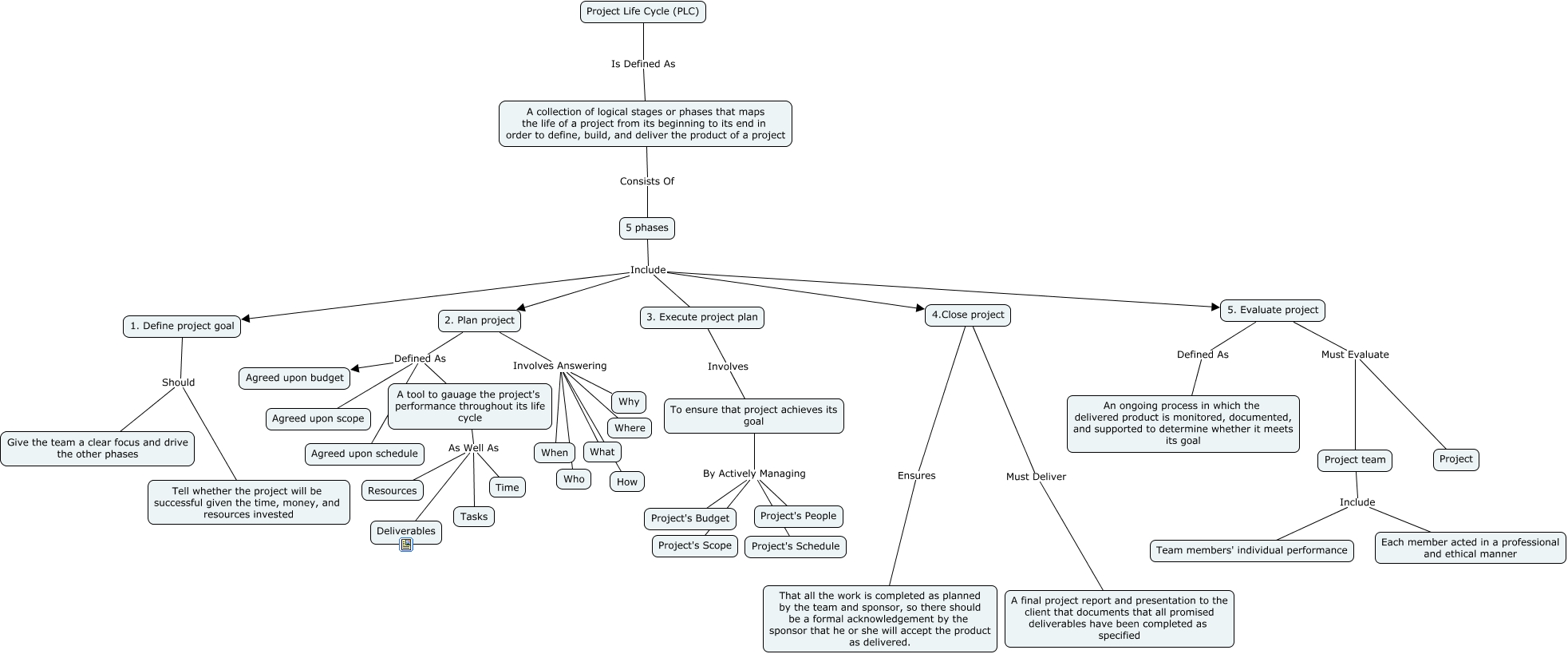 This Concept Map, created with IHMC CmapTools, has information related to: Generic Project Life Cycle, 5. Evaluate project Defined As An ongoing process in which the delivered product is monitored, documented, and supported to determine whether it meets its goal, 2. Plan project Defined As Agreed upon scope, 5 phases Include 4.Close project, 2. Plan project Defined As Agreed upon budget, A tool to gauage the project's performance throughout its life cycle As Well As Time, 5 phases Include 5. Evaluate project, A collection of logical stages or phases that maps the life of a project from its beginning to its end in order to define, build, and deliver the product of a project Consists Of 5 phases, A tool to gauage the project's performance throughout its life cycle As Well As Deliverables, Project team Include Team members' individual performance, 2. Plan project Involves Answering What, Project team Include Each member acted in a professional and ethical manner, 2. Plan project Involves Answering How, 2. Plan project Involves Answering When, To ensure that project achieves its goal By Actively Managing Project's Budget, To ensure that project achieves its goal By Actively Managing Project's Scope, 5. Evaluate project Must Evaluate Project team, 2. Plan project Defined As A tool to gauage the project's performance throughout its life cycle, A tool to gauage the project's performance throughout its life cycle As Well As Resources, 3. Execute project plan Involves To ensure that project achieves its goal, 2. Plan project Involves Answering Why