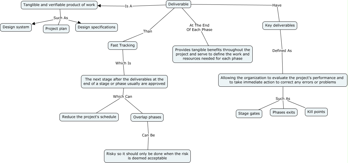 This Concept Map, created with IHMC CmapTools, has information related to: Deliverables, Allowing the organization to evaluate the project's performance and to take immediate action to correct any errors or problems Such As Phases exits, Deliverable Is A Tanglible and verifiable product of work, The next stage after the deliverables at the end of a stage or phase usually are approved Which Can Reduce the project's schedule, Tanglible and verifiable product of work Such As Project plan, Tanglible and verifiable product of work Such As Design specifications, The next stage after the deliverables at the end of a stage or phase usually are approved Which Can Overlap phases, Fast Tracking Which Is The next stage after the deliverables at the end of a stage or phase usually are approved, Tanglible and verifiable product of work Such As Design system, Allowing the organization to evaluate the project's performance and to take immediate action to correct any errors or problems Such As Stage gates, Deliverable Than Fast Tracking, Overlap phases Can Be Risky so it should only be done when the risk is deemed acceptable, Key deliverables Defined As Allowing the organization to evaluate the project's performance and to take immediate action to correct any errors or problems, Deliverable Have Key deliverables, Allowing the organization to evaluate the project's performance and to take immediate action to correct any errors or problems Such As Kill points, Deliverable At The End Of Each Phase Provides tangible benefits throughout the project and serve to define the work and resources needed for each phase