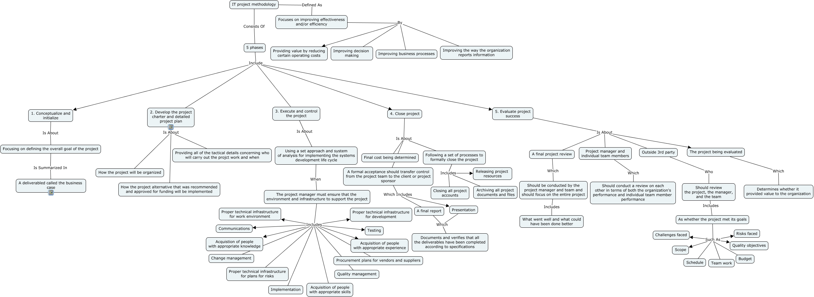 This Concept Map, created with IHMC CmapTools, has information related to: IT Project Methodology, 2. Develop the project charter and detailed project plan Is About How the project alternative that was recommended and approved for funding will be implemented, Should be conducted by the project manager and team and should focus on the entire project Includes What went well and what could have been done better, The project manager must ensure that the environment and infrastructure to support the project Includes Quality management, Following a set of processes to formally close the project Includes Archiving all project documents and files, As whether the project met its goals Such As Budget, Following a set of processes to formally close the project Includes Releasing project resources, 4. Close project Is About Final cost being determined, Should review the project, the manager, and the team Includes As whether the project met its goals, As whether the project met its goals Such As Schedule, Presentation Which Documents and verifies that all the deliverables have been completed according to specifications, 5 phases Include 2. Develop the project charter and detailed project plan, 3. Execute and control the project Is About Using a set approach and system of analysis for implementing the systems development life cycle, As whether the project met its goals Such As Risks faced, Using a set approach and system of analysis for implementing the systems development life cycle When The project manager must ensure that the environment and infrastructure to support the project, 5 phases Include 5. Evaluate project success, The project manager must ensure that the environment and infrastructure to support the project Includes Acquisition of people with appropriate experience, Outside 3rd party Who Should review the project, the manager, and the team, The project manager must ensure that the environment and infrastructure to support the project Includes Proper technical infrastructure for development, The project manager must ensure that the environment and infrastructure to support the project Includes Communications, Following a set of processes to formally close the project Includes Closing all project accounts