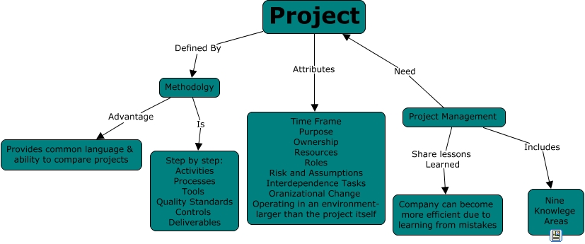This Concept Map, created with IHMC CmapTools, has information related to: Chapter One, Project Defined By Methodolgy, Project Management Need Project, Project Attributes Time Frame Purpose Ownership Resources Roles Risk and Assumptions Interdependence Tasks Oranizational Change Operating in an environment- larger than the project itself, Methodolgy Advantage Provides common language & ability to compare projects, Project Management Includes Nine Knowlege Areas, Project Management Share lessons Learned Company can become more efficient due to learning from mistakes, Methodolgy Is Step by step: Activities Processes Tools Quality Standards Controls Deliverables