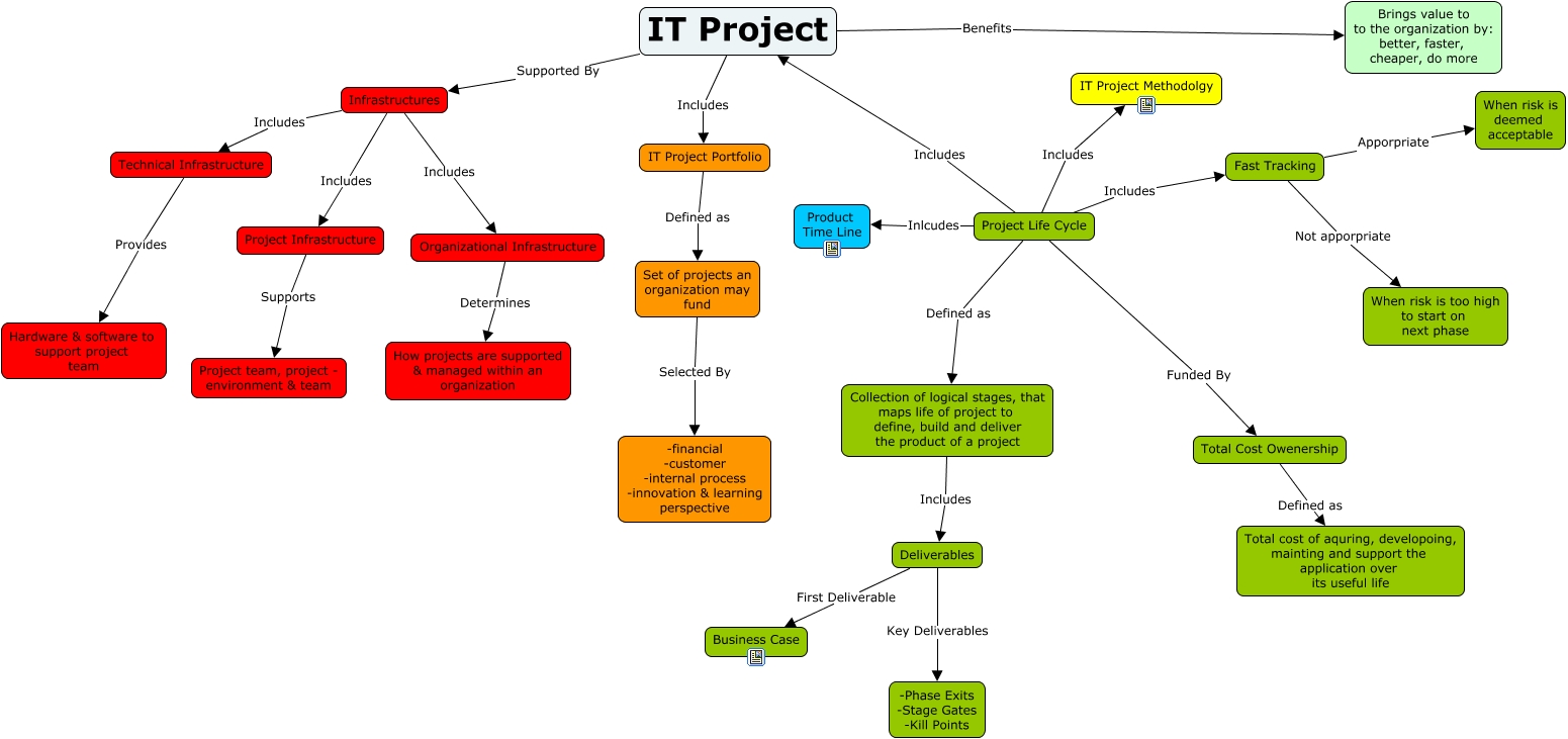 This Concept Map, created with IHMC CmapTools, has information related to: Chapter Two, Deliverables Key Deliverables -Phase Exits -Stage Gates -Kill Points, Project Life Cycle Includes Fast Tracking, Project Life Cycle Inlcudes Product Time Line, IT Project Portfolio Defined as Set of projects an organization may fund, IT Project Includes IT Project Portfolio, IT Project Supported By Infrastructures, IT Project Benefits Brings value to to the organization by: better, faster, cheaper, do more, Collection of logical stages, that maps life of project to define, build and deliver the product of a project Includes Deliverables, Project Life Cycle Includes IT Project Methodolgy, Total Cost Owenership Defined as Total cost of aquring, developoing, mainting and support the application over its useful life, Project Life Cycle Defined as Collection of logical stages, that maps life of project to define, build and deliver the product of a project, Deliverables First Deliverable Business Case, Fast Tracking Not apporpriate When risk is too high to start on next phase, Infrastructures Includes Project Infrastructure, Organizational Infrastructure Determines How projects are supported & managed within an organization, Project Life Cycle Includes IT Project, Project Life Cycle Funded By Total Cost Owenership, Technical Infrastructure Provides Hardware & software to support project team, Infrastructures Includes Technical Infrastructure, Fast Tracking Apporpriate When risk is deemed acceptable