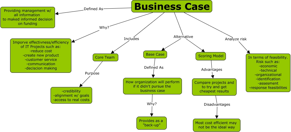 This Concept Map, created with IHMC CmapTools, has information related to: BusinessCase, Base Case Defined As How organization will perform if it didn't pursue the business case, Business Case Defined As Providing management w/ all information to maked informed decision on funding, Business Case Includes Core Team, How organization will perform if it didn't pursue the business case Why? Provides as a "back-up", Business Case Alternative Scoring Model, Compare projects and to try and get cheapest results Disadvantages Most cost efficient may not be the ideal way, Business Case Alternative Base Case, Business Case Why? Imporve effectivness/efficiency of IT Projects such as: -reduce cost -create new product -customer service -communication -deciscion making, Scoring Model Advantages Compare projects and to try and get cheapest results, Business Case Analyze risk In terms of feasibility. Risk such as: -economic -technical -organizational -identification -assesment -response feasibilites, Core Team Purpose -credibility -alignment w/ goals -access to real costs