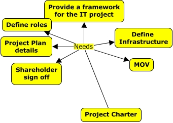 This Concept Map, created with IHMC CmapTools, has information related to: Ch 3 Part 1, Project Charter Needs Provide a framework for the IT project, Project Charter Needs Define roles, Project Charter Needs MOV, Project Charter Needs Define Infrastructure, Project Charter Needs Project Plan details, Project Charter Needs Shareholder sign off