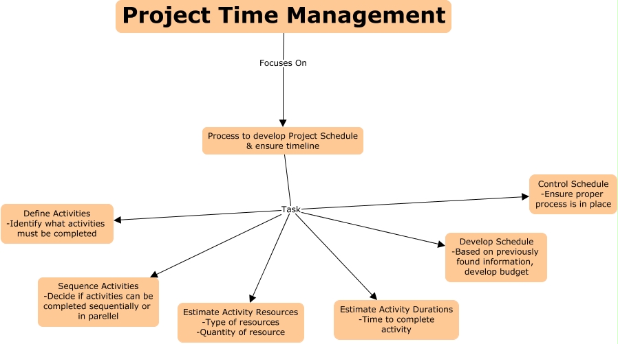 This Concept Map, created with IHMC CmapTools, has information related to: ProjectTimeManagement, Process to develop Project Schedule & ensure timeline Task Estimate Activity Resources -Type of resources -Quantity of resource, Project Time Management Focuses On Process to develop Project Schedule & ensure timeline, Process to develop Project Schedule & ensure timeline Task Develop Schedule -Based on previously found information, develop budget, Process to develop Project Schedule & ensure timeline Task Estimate Activity Durations -Time to complete activity, Process to develop Project Schedule & ensure timeline Task Control Schedule -Ensure proper process is in place, Process to develop Project Schedule & ensure timeline Task Sequence Activities -Decide if activities can be completed sequentially or in parellel, Process to develop Project Schedule & ensure timeline Task Define Activities -Identify what activities must be completed