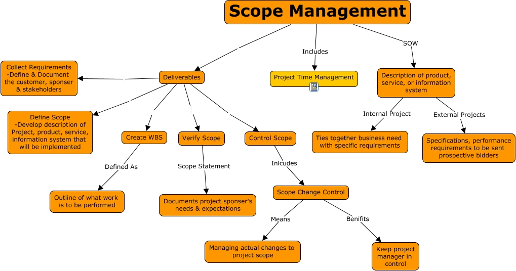 This Concept Map, created with IHMC CmapTools, has information related to: Chapter Five & Chapter Six, Control Scope Inlcudes Scope Change Control, Deliverables Define Scope -Develop description of Project, product, service, information system that will be implemented, Scope Management SOW Description of product, service, or information system, Deliverables Control Scope, Scope Management Deliverables, Deliverables Collect Requirements -Define & Document the customer, sponser & stakeholders, Description of product, service, or information system External Projects Specifications, performance requirements to be sent prospective bidders, Scope Management Includes Project Time Management, Description of product, service, or information system Internal Project Ties together business need with specific requirements, Scope Change Control Benifits Keep project manager in control, Deliverables Create WBS, Verify Scope Scope Statement Documents project sponser's needs & expectations, Scope Change Control Means Managing actual changes to project scope, Create WBS Defined As Outline of what work is to be performed, Deliverables Verify Scope
