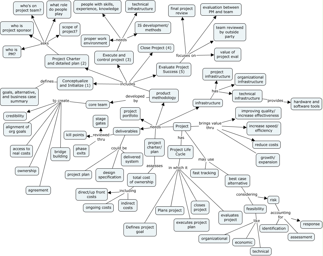 This Concept Map, created with IHMC CmapTools, has information related to: Chapter Two, Project Life Cycle in which it evaluates project, product methodology includes Project Charter and detailed plan (2), Project Life Cycle in which it Defines project goal, project charter/ plan assesses total cost of ownership, best case alternative considering risk, technical infrastructure provides hardware and software tools, infrastructure has project infrastructure, Evaluate Project Success (5) focuses on value of project eval, Evaluate Project Success (5) focuses on evaluation between PM and team, Project Charter and detailed plan (2) asks who is PM?, deliverables reviewed thru stage gates, deliverables could be project plan, Project has Project Life Cycle, product methodology includes Execute and control project (3), Evaluate Project Success (5) focuses on team reviewed by outside party, total cost of ownership including ongoing costs, Project brings value thru increase speed/ efficiency, feasibility like organizational, product methodology includes Evaluate Project Success (5), Execute and control project (3) needs IS development/ methods