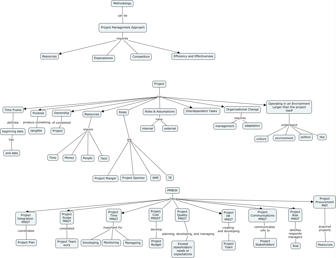 This Concept Map, created with IHMC CmapTools, has information related to: Chapter 1 MT, Organizational Change requires adaptation, Time Frame definitie beginning date, Project Time MNGT important for Manageing, PMBOK has Project Time MNGT, Project has Roles, beginning date has end date, PMBOK has Project Integration MNGT, Project Management Approach requires Expecataions, Project Integration MNGT coordinates Project Plan, Project Procurement MNT acquired properly Resources, Operating in an Envrionment Larger than the project itself understand culture, Resources require Tech, Project Scope MNGT completed Project Team work, Project has Risks & Assumptions, Project has Time Frame, PMBOK has Project Cost MNGtT, Project has Resources, Project Management Approach requires Resources, Project has Operating in an Envrionment Larger than the project itself, Resources require Time