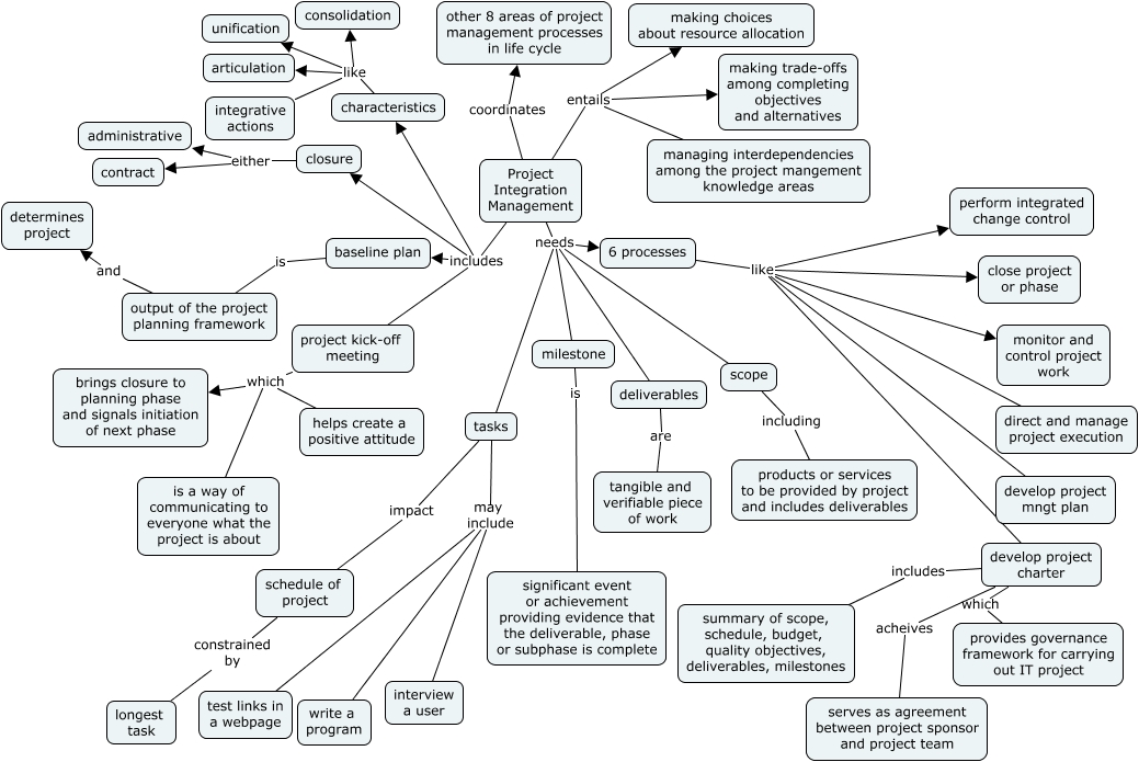 This Concept Map, created with IHMC CmapTools, has information related to: Chapter Three, tasks may include write a program, Project Integration Management coordinates other 8 areas of project management processes in life cycle, Project Integration Management needs scope, Project Integration Management includes baseline plan, Project Integration Management entails making choices about resource allocation, 6 processes like direct and manage project execution, 6 processes like develop project mngt plan, project kick-off meeting which brings closure to planning phase and signals initiation of next phase, Project Integration Management entails managing interdependencies among the project mangement knowledge areas, closure either contract, develop project charter which provides governance framework for carrying out IT project, scope including products or services to be provided by project and includes deliverables, Project Integration Management includes project kick-off meeting, characteristics like articulation, Project Integration Management needs milestone, deliverables are tangible and verifiable piece of work, output of the project planning framework and determines project, closure either administrative, Project Integration Management needs 6 processes, 6 processes like close project or phase