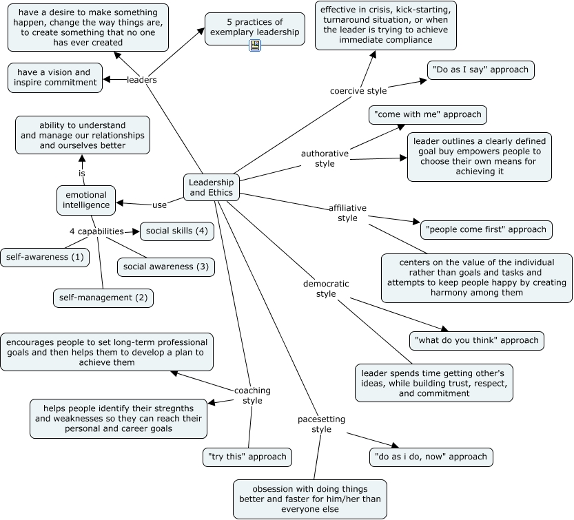 This Concept Map, created with IHMC CmapTools, has information related to: Chapter Thirteen, Leadership and Ethics coercive style effective in crisis, kick-starting, turnaround situation, or when the leader is trying to achieve immediate compliance, Leadership and Ethics democratic style leader spends time getting other's ideas, while building trust, respect, and commitment, Leadership and Ethics pacesetting style "do as i do, now" approach, emotional intelligence 4 capabilities self-management (2), Leadership and Ethics affiliative style "people come first" approach, Leadership and Ethics coercive style "Do as I say" approach, Leadership and Ethics leaders 5 practices of exemplary leadership, Leadership and Ethics use emotional intelligence, Leadership and Ethics coaching style encourages people to set long-term professional goals and then helps them to develop a plan to achieve them, Leadership and Ethics affiliative style centers on the value of the individual rather than goals and tasks and attempts to keep people happy by creating harmony among them, Leadership and Ethics democratic style "what do you think" approach, Leadership and Ethics leaders have a desire to make something happen, change the way things are, to create something that no one has ever created, emotional intelligence 4 capabilities self-awareness (1), emotional intelligence is ability to understand and manage our relationships and ourselves better, emotional intelligence 4 capabilities social awareness (3), Leadership and Ethics authorative style "come with me" approach, Leadership and Ethics authorative style leader outlines a clearly defined goal buy empowers people to choose their own means for achieving it, Leadership and Ethics coaching style helps people identify their stregnths and weaknesses so they can reach their personal and career goals, emotional intelligence 4 capabilities social skills (4), Leadership and Ethics coaching style "try this" approach