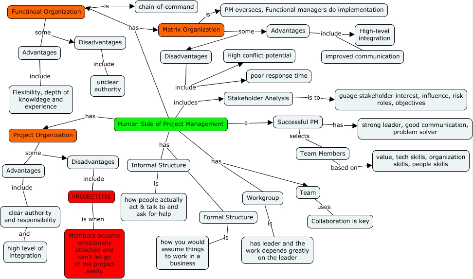 This Concept Map, created with IHMC CmapTools, has information related to: Chapter 4, Advantages include clear authority and responsibility, Informal Structure is how people actually act & talk to and ask for help, Matrix Organization some Disadvantages, Team Members based on value, tech skills, organization skills, people skills, Advantages include improved communication, Disadvantages include High conflict potential, Human Side of Project Management has Functinoal Organization, Matrix Organization is PM oversees, Functional managers do implementation, Disadvantages include poor response time, Successful PM selects Team Members, Functinoal Organization is chain-of-command, Team uses Collaboration is key, Successful PM has strong leader, good communication, problem solver, Formal Structure is how you would assume things to work in a business, Human Side of Project Management has Workgroup, Functinoal Organization some Advantages, clear authority and responsibility and high level of integration, Advantages include Flexibility, depth of knowldege and experience, Disadvantages include unclear authority, Project Organization some Advantages