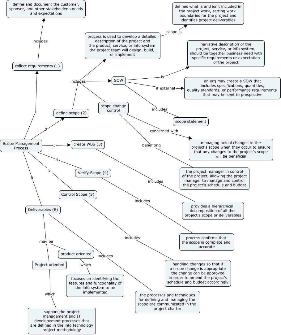 This Concept Map, created with IHMC CmapTools, has information related to: Scope management process, Deliverables (6) includes the processes and techniques for defining and managing the scope are communicated in the project charter, create WBS (3) includes provides a hierarchical decomposition of all the project's scope or deliverables, Scope Management Process 3 create WBS (3), process is used to develop a detailed description of the project and the product, service, or info system the project team will design, build, or implement scope is defines what is and isn't included in the project work, setting work boundaries for the project and identifies project deliverables, scope change control benefiting the project manager in control of the project, allowing the project manager to manage and control the project's schedule and budget, Deliverables (6) may be Project oriented, Project oriented which support the project management and IT developement processes that are defined in the info technology project methodology, Scope Management Process 6 Deliverables (6), SOW if external an org may create a SOW that includes specifications, quantities, quality standards, or performance requirements that may be sent to prospective, Verify Scope (4) includes process confirms that the scope is complete and accurate, Scope Management Process 4 Verify Scope (4), scope change control concerned with managing actual changes to the project's scope when they occur to ensure that any changes to the project's scope will be beneficial, define scope (2) includes process is used to develop a detailed description of the project and the product, service, or info system the project team will design, build, or implement, Scope Management Process 1 collect requirements (1), collect requirements (1) includes define and document the customer, sponsor, and other stakeholder's needs and expectations, define scope (2) includes SOW, product oriented which focuses on identifying the features and functionality of the info system to be implemented, define scope (2) includes scope change control, Scope Management Process 5 Control Scope (5), SOW is narrative description of the project, service, or info system, should tie together business need with specific requirements or expectation of the project