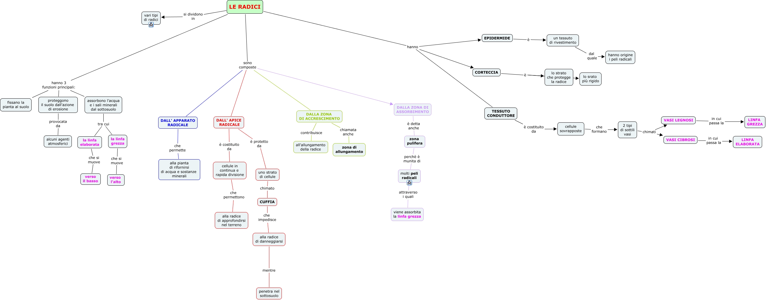 Questa Cmap, creata con IHMC CmapTools, contiene informazioni relative a: le radici 1, EPIDERMIDE è un tessuto di rivestimento, cellule sovrapposte che formano 2 tipi di sottili vasi, DALL' APICE RADICALE è protetto da uno strato di cellule, alla radice di danneggiarsi mentre penetra nel sottosuolo, un tessuto di rivestimento dal quale hanno origine i peli radicali, DALL' APPARATO RADICALE che permette alla pianta di rifornirsi di acqua e sostanze minerali, CORTECCIA è lo srato più rigido, la linfa elaborata che si muove verso il basso, LE RADICI sono composte DALLA ZONA DI ACCRESCIMENTO, DALL' APICE RADICALE è costituito da cellule in continua e rapida divisione, LE RADICI hanno TESSUTO CONDUTTORE, molti peli radicali attraverso i quali viene assorbita la linfa grezza, LE RADICI hanno 3 funzioni principali: assorbono l'acqua e i sali minerali dal sottosuolo, TESSUTO CONDUTTORE è costituito da cellule sovrapposte, DALLA ZONA DI ASSORBIMENTO è detta anche zona pulifera, LE RADICI hanno 3 funzioni principali: proteggono il suolo dall'azione di erosione, LE RADICI hanno 3 funzioni principali: fissano la pianta al suolo, la linfa grezza che si muove verso l'alto, assorbono l'acqua e i sali minerali dal sottosuolo tra cui la linfa grezza, VASI LEGNOSI in cui passa la LINFA GREZZA