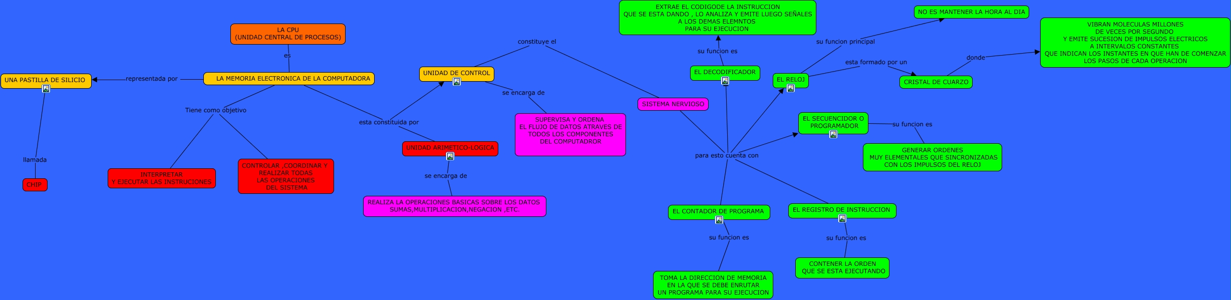 Este Cmap, tiene información relacionada con: LA CPU, LA MEMORIA ELECTRONICA DE LA COMPUTADORA Tiene como objetivo CONTROLAR ,COORDINAR Y REALIZAR TODAS LAS OPERACIONES DEL SISTEMA, SISTEMA NERVIOSO para esto cuenta con EL CONTADOR DE PROGRAMA, EL REGISTRO DE INSTRUCCION su funcion es CONTENER LA ORDEN QUE SE ESTA EJECUTANDO, LA CPU (UNIDAD CENTRAL DE PROCESOS) es LA MEMORIA ELECTRONICA DE LA COMPUTADORA, UNIDAD DE CONTROL se encarga de SUPERVISA Y ORDENA EL FLUJO DE DATOS ATRAVES DE TODOS LOS COMPONENTES DEL COMPUTADROR, SISTEMA NERVIOSO para esto cuenta con EL REGISTRO DE INSTRUCCION, UNIDAD ARIMETICO-LOGICA se encarga de REALIZA LA OPERACIONES BASICAS SOBRE LOS DATOS SUMAS,MULTIPLICACION,NEGACION ,ETC., UNA PASTILLA DE SILICIO llamada CHIP, LA MEMORIA ELECTRONICA DE LA COMPUTADORA esta constituida por UNIDAD ARIMETICO-LOGICA, EL SECUENCIDOR O PROGRAMADOR su funcion es GENERAR ORDENES MUY ELEMENTALES QUE SINCRONIZADAS CON LOS IMPULSOS DEL RELOJ, SISTEMA NERVIOSO para esto cuenta con EL DECODIFICADOR, LA MEMORIA ELECTRONICA DE LA COMPUTADORA representada por UNA PASTILLA DE SILICIO, LA MEMORIA ELECTRONICA DE LA COMPUTADORA Tiene como objetivo INTERPRETAR Y EJECUTAR LAS INSTRUCIONES, EL CONTADOR DE PROGRAMA su funcion es TOMA LA DIRECCION DE MEMORIA EN LA QUE SE DEBE ENRUTAR UN PROGRAMA PARA SU EJECUCION, SISTEMA NERVIOSO para esto cuenta con EL RELOJ, UNIDAD DE CONTROL constituye el SISTEMA NERVIOSO, LA MEMORIA ELECTRONICA DE LA COMPUTADORA esta constituida por UNIDAD DE CONTROL, CRISTAL DE CUARZO donde VIBRAN MOLECULAS MILLONES DE VECES POR SEGUNDO Y EMITE SUCESION DE IMPULSOS ELECTRICOS A INTERVALOS CONSTANTES QUE INDICAN LOS INSTANTES EN QUE HAN DE COMENZAR LOS PASOS DE CADA OPERACION, EL RELOJ esta formado por un CRISTAL DE CUARZO, EL DECODIFICADOR su funcion es EXTRAE EL CODIGODE LA INSTRUCCION QUE SE ESTA DANDO , LO ANALIZA Y EMITE LUEGO SEÑALES A LOS DEMAS ELEMNTOS PARA SU EJECUCION
