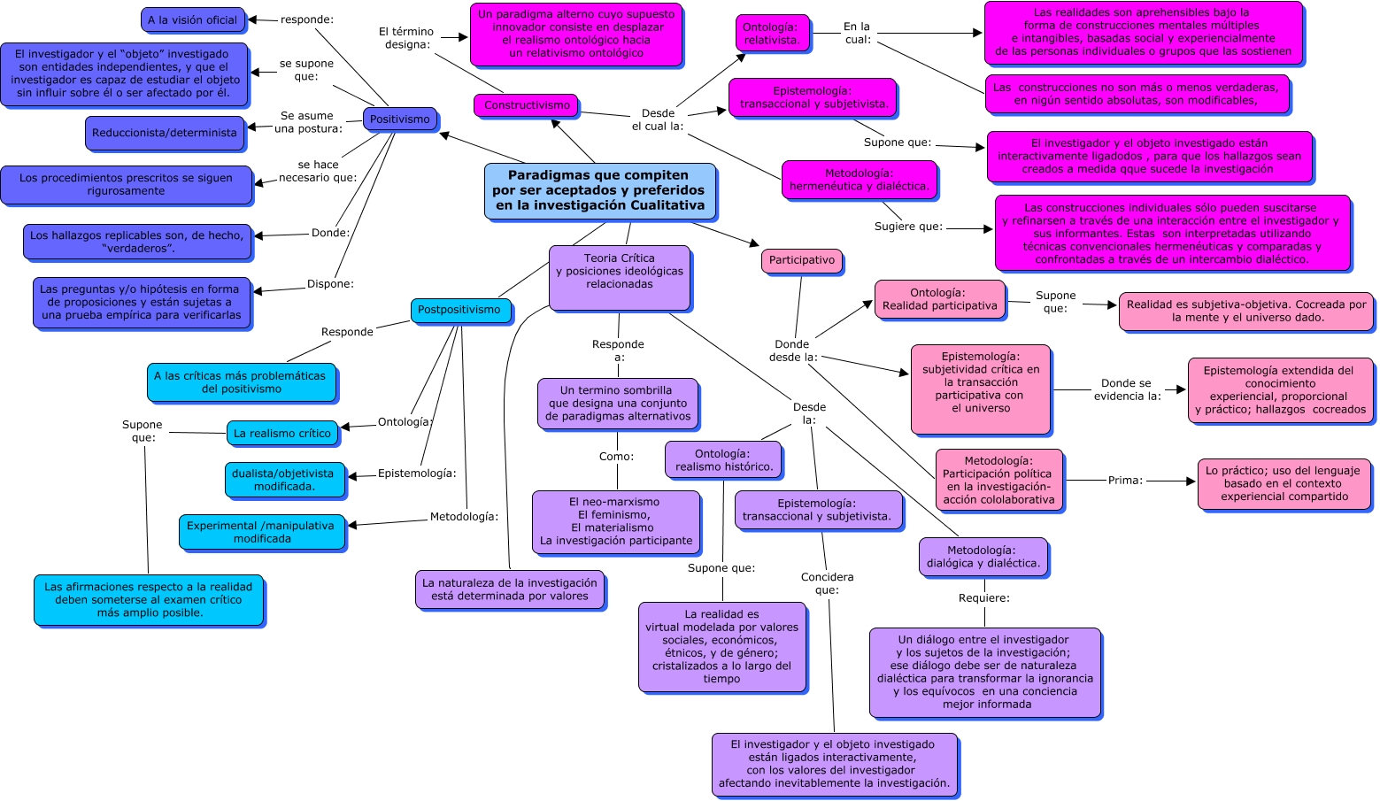 Este Cmap, tiene información relacionada con: Caracteristicas de los principales paradigmas de investigación, Paradigmas que compiten por ser aceptados y preferidos en la investigación Cualitativa Cualitativa Postpositivismo, Positivismo responde: A la visión oficial, Constructivismo Desde el cual la: Epistemología: transaccional y subjetivista., Positivismo se hace necesario que: Los procedimientos prescritos se siguen rigurosamente, Participativo Donde desde la: Epistemología: subjetividad crítica en la transacción participativa con el universo, Postpositivismo Metodología: Experimental /manipulativa modificada, Epistemología: transaccional y subjetivista. Concidera que: El investigador y el objeto investigado están ligados interactivamente, con los valores del investigador afectando inevitablemente la investigación., Paradigmas que compiten por ser aceptados y preferidos en la investigación Cualitativa Cualitativa Constructivismo, Metodología: dialógica y dialéctica. Requiere: Un diálogo entre el investigador y los sujetos de la investigación; ese diálogo debe ser de naturaleza dialéctica para transformar la ignorancia y los equívocos en una conciencia mejor informada, Positivismo se supone que: El investigador y el “objeto” investigado son entidades independientes, y que el investigador es capaz de estudiar el objeto sin influir sobre él o ser afectado por él., Postpositivismo Responde A las críticas más problemáticas del positivismo, Un termino sombrilla que designa una conjunto de paradigmas alternativos Como: El neo-marxismo El feminismo, El materialismo La investigación participante, Participativo Donde desde la: Metodología: Participación política en la investigación- acción cololaborativa, Positivismo Donde: Los hallazgos replicables son, de hecho, “verdaderos”., Paradigmas que compiten por ser aceptados y preferidos en la investigación Cualitativa Cualitativa Positivismo, Postpositivismo Ontología: La realismo crítico, Teoria Crítica y posiciones ideológicas relacionadas Desde la: Epistemología: transaccional y subjetivista., Postpositivismo Epistemología: dualista/objetivista modificada., Teoria Crítica y posiciones ideológicas relacionadas Desde la: Ontología: realismo histórico., Paradigmas que compiten por ser aceptados y preferidos en la investigación Cualitativa Cualitativa Participativo