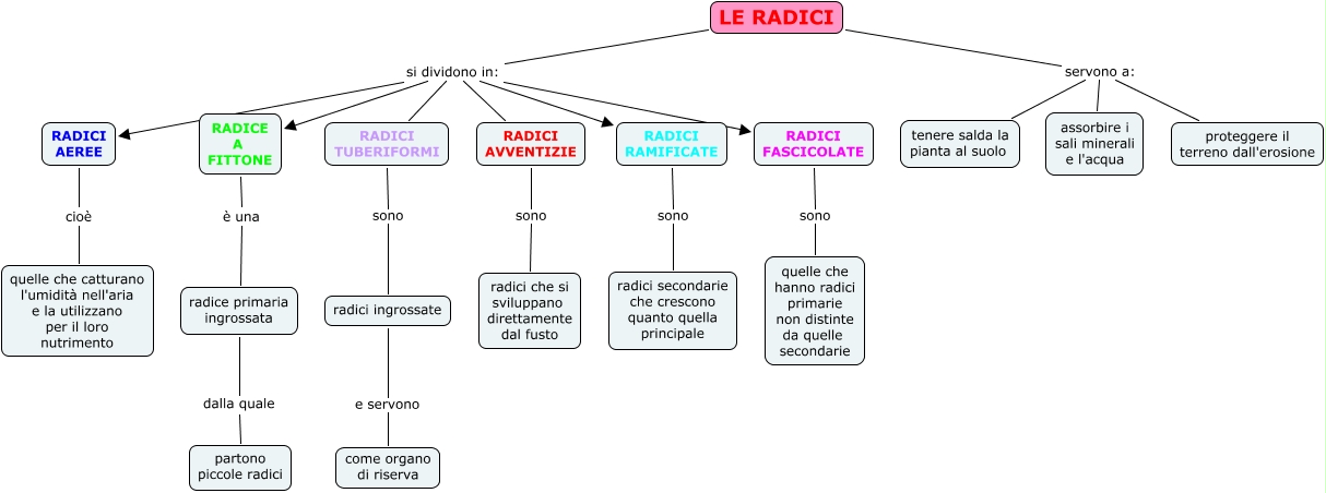 Questa Cmap, creata con IHMC CmapTools, contiene informazioni relative a: le radici, radice primaria ingrossata dalla quale partono piccole radici, LE RADICI si dividono in: RADICI RAMIFICATE, RADICE A FITTONE è una radice primaria ingrossata, RADICI RAMIFICATE sono radici secondarie che crescono quanto quella principale, LE RADICI si dividono in: RADICI AEREE, LE RADICI servono a: assorbire i sali minerali e l'acqua, RADICI TUBERIFORMI sono radici ingrossate, RADICI AVVENTIZIE sono radici che si sviluppano direttamente dal fusto, RADICI AEREE cioè quelle che catturano l'umidità nell'aria e la utilizzano per il loro nutrimento, LE RADICI si dividono in: RADICE A FITTONE, LE RADICI si dividono in: RADICI FASCICOLATE, LE RADICI si dividono in: RADICI TUBERIFORMI, LE RADICI si dividono in: RADICI AVVENTIZIE, radici ingrossate e servono come organo di riserva, LE RADICI servono a: tenere salda la pianta al suolo, RADICI FASCICOLATE sono quelle che hanno radici primarie non distinte da quelle secondarie, LE RADICI servono a: proteggere il terreno dall'erosione