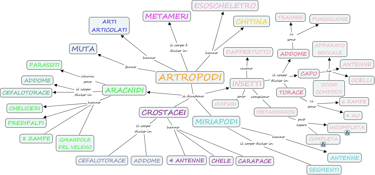Questa Cmap, creata con IHMC CmapTools, contiene informazioni relative a: ARTROPODI, ARTROPODI si dividono ARACNIDI, ARTROPODI il corpo è diviso in METAMERI, INSETTI il corpo diviso in ADDOME, METAMORFOSI può essere INCOMPLETA, MIRIAPODI il corpo diviso in SEGMENTI, ARTROPODI si dividono INSETTI, MIRIAPODI hanno ANTENNE, ARTROPODI fanno MUTA, CAPO ha ANTENNE, CROSTACEI il corpo diviso in CEFALOTORACE, ARACNIDI hanno GHIANDOLE DEL VELENO, CROSTACEI hanno CHELE, METAMORFOSI può essere COMPLETA, TORACE ci sono 4 ALI, INSETTI compiono METAMORFOSI, ADDOME ci sono PUNGIGLIONE, INSETTI il corpo diviso in TORACE, ARACNIDI hanno CHELICERI, ARACNIDI hanno PREDIPALPI, INSETTI il corpo diviso in CAPO
