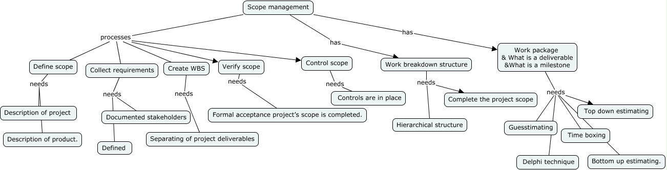 This Concept Map, created with IHMC CmapTools, has information related to: Chapter 5 & 6, Scope management processes Control scope, Collect requirements needs Documented stakeholders, Create WBS needs Separating of project deliverables, Collect requirements needs Defined, Define scope needs Description of project, Work package & What is a deliverable &What is a milestone needs Bottom up estimating., Scope management processes Collect requirements, Scope management processes Create WBS, Work breakdown structure needs Complete the project scope, Scope management processes Verify scope, Verify scope needs Formal acceptance project’s scope is completed., Work package & What is a deliverable &What is a milestone needs Top down estimating, Control scope needs Controls are in place, Define scope needs Description of product., Work breakdown structure needs Hierarchical structure, Scope management processes Define scope, Work package & What is a deliverable &What is a milestone needs Time boxing, Scope management has Work package & What is a deliverable &What is a milestone, Work package & What is a deliverable &What is a milestone needs Guesstimating, Work package & What is a deliverable &What is a milestone needs Delphi technique