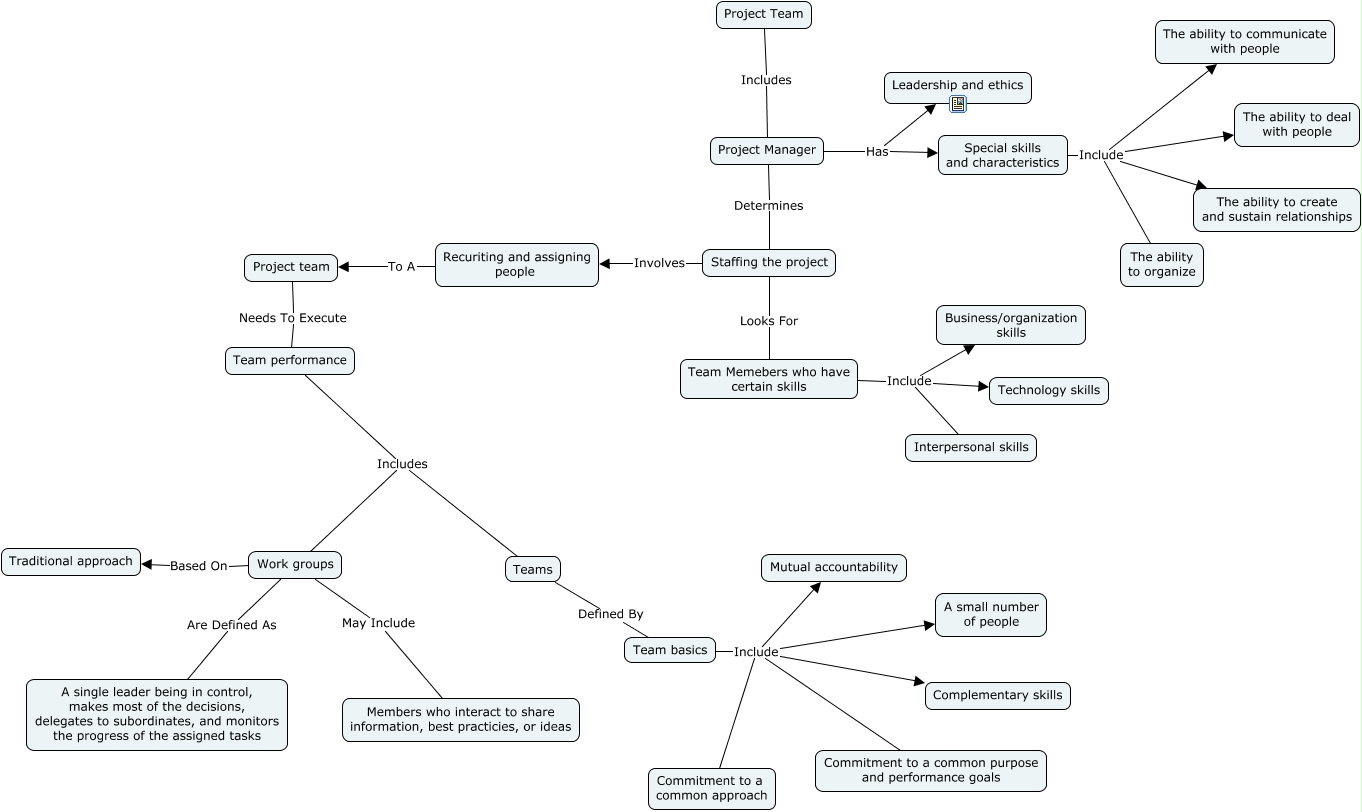 This Concept Map, created with IHMC CmapTools, has information related to: Project Team, Work groups Based On Traditional approach, Teams Defined By Team basics, Project team Needs To Execute Team performance, Team basics Include Mutual accountability, Team basics Include Complementary skills, Project Manager Has Leadership and ethics, Team basics Include Commitment to a common purpose and performance goals, Project Manager Determines Staffing the project, Team performance Includes Work groups, Special skills and characteristics Include The ability to create and sustain relationships, Team basics Include Commitment to a common approach, Work groups Are Defined As A single leader being in control, makes most of the decisions, delegates to subordinates, and monitors the progress of the assigned tasks, Special skills and characteristics Include The ability to communicate with people, Project Team Includes Project Manager, Project Manager Has Special skills and characteristics, Team Memebers who have certain skills Include Business/organization skills, Team basics Include A small number of people, Team performance Includes Teams, Recuriting and assigning people To A Project team, Work groups May Include Members who interact to share information, best practicies, or ideas