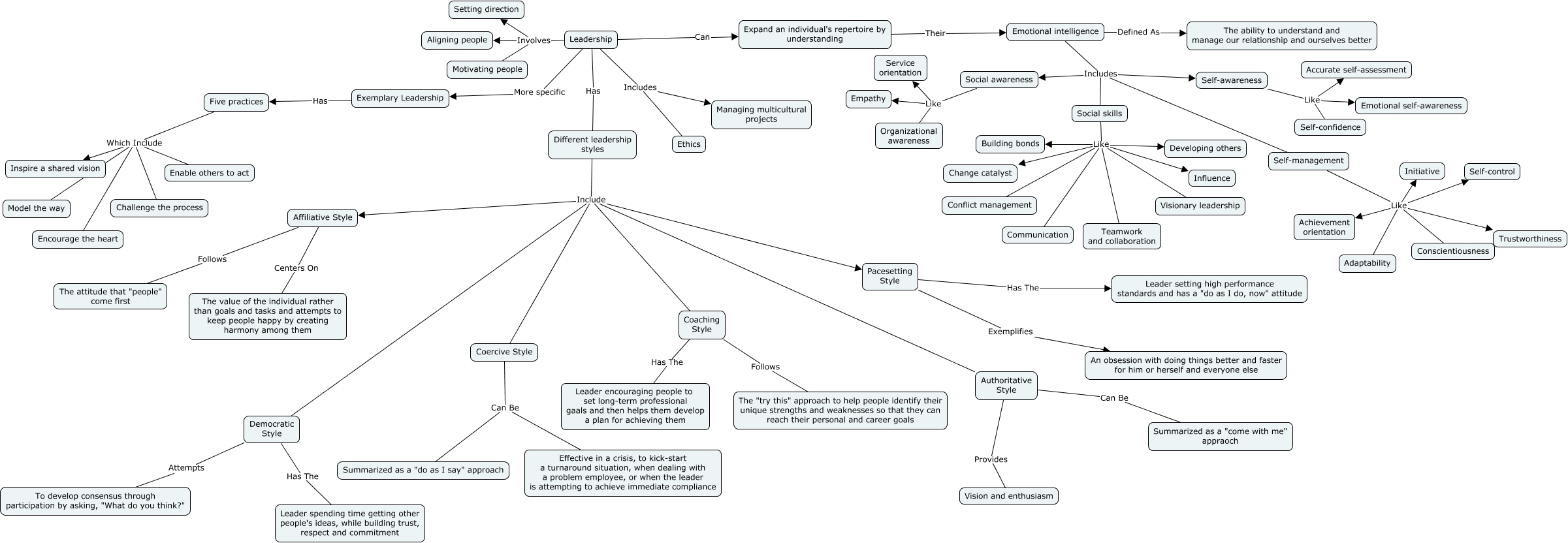 This Concept Map, created with IHMC CmapTools, has information related to: Leadership and Ethics, Social skills Like Building bonds, Social skills Like Influence, Self-management Like Conscientiousness, Different leadership styles Include Coercive Style, Different leadership styles Include Coaching Style, Emotional intelligence Includes Social awareness, Self-management Like Initiative, Pacesetting Style Exemplifies An obsession with doing things better and faster for him or herself and everyone else, Five practices Which Include Inspire a shared vision, Five practices Which Include Challenge the process, Social skills Like Developing others, Expand an individual's repertoire by understanding Their Emotional intelligence, Leadership Involves Aligning people, Social skills Like Teamwork and collaboration, Emotional intelligence Defined As The ability to understand and manage our relationship and ourselves better, Social awareness Like Organizational awareness, Leadership Includes Ethics, Pacesetting Style Has The Leader setting high performance standards and has a "do as I do, now" attitude, Different leadership styles Include Authoritative Style, Social skills Like Communication