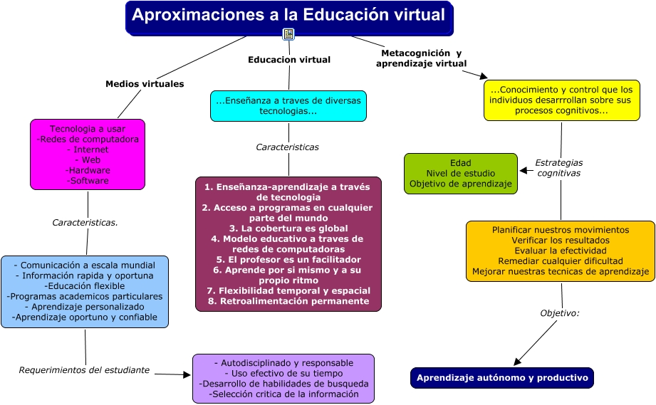 Este Cmap, tiene información relacionada con: Aproximacion a la educ virtual, Aproximaciones a la Educación virtual Medios virtuales Tecnologia a usar -Redes de computadora - Internet - Web -Hardware -Software, - Comunicación a escala mundial - Información rapida y oportuna -Educación flexible -Programas academicos particulares - Aprendizaje personalizado -Aprendizaje oportuno y confiable Requerimientos del estudiante - Autodisciplinado y responsable - Uso efectivo de su tiempo -Desarrollo de habilidades de busqueda -Selección critica de la información, Aproximaciones a la Educación virtual Metacognición y aprendizaje virtual ...Conocimiento y control que los individuos desarrrollan sobre sus procesos cognitivos..., ...Enseñanza a traves de diversas tecnologias... Caracteristicas 1. Enseñanza-aprendizaje a través de tecnologia 2. Acceso a programas en cualquier parte del mundo 3. La cobertura es global 4. Modelo educativo a traves de redes de computadoras 5. El profesor es un facilitador 6. Aprende por si mismo y a su propio ritmo 7. Flexibilidad temporal y espacial 8. Retroalimentación permanente, Tecnologia a usar -Redes de computadora - Internet - Web -Hardware -Software Caracteristicas. - Comunicación a escala mundial - Información rapida y oportuna -Educación flexible -Programas academicos particulares - Aprendizaje personalizado -Aprendizaje oportuno y confiable, Aproximaciones a la Educación virtual Educacion virtual ...Enseñanza a traves de diversas tecnologias..., ...Conocimiento y control que los individuos desarrrollan sobre sus procesos cognitivos... Estrategias cognitivas Edad Nivel de estudio Objetivo de aprendizaje, Planificar nuestros movimientos Verificar los resultados Evaluar la efectividad Remediar cualquier dificultad Mejorar nuestras tecnicas de aprendizaje Estrategias cognitivas Edad Nivel de estudio Objetivo de aprendizaje, Planificar nuestros movimientos Verificar los resultados Evaluar la efectividad Remediar cualquier dificultad Mejorar nuestras tecnicas de aprendizaje Objetivo: Aprendizaje autónomo y productivo, ...Conocimiento y control que los individuos desarrrollan sobre sus procesos cognitivos... Estrategias cognitivas Planificar nuestros movimientos Verificar los resultados Evaluar la efectividad Remediar cualquier dificultad Mejorar nuestras tecnicas de aprendizaje