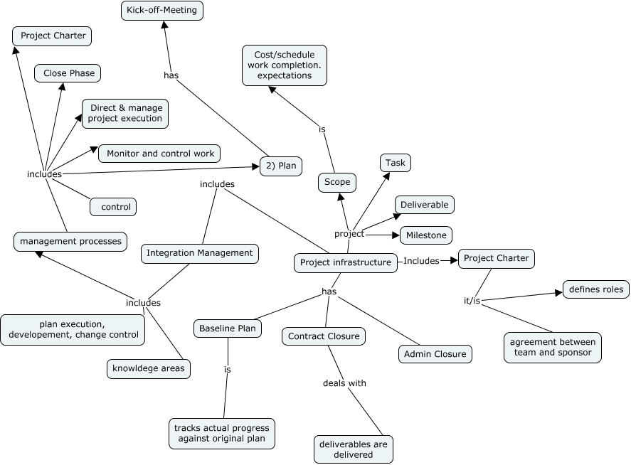 This Concept Map, created with IHMC CmapTools, has information related to: Ch 3, Baseline Plan is tracks actual progress against original plan, Project infrastructure has Baseline Plan, Project infrastructure project Deliverable, Project infrastructure has Admin Closure, Project infrastructure has Contract Closure, Project infrastructure project Task, Project Charter it/is agreement between team and sponsor, Project infrastructure project Milestone, management processes includes control, Project Charter it/is defines roles, Scope is Cost/schedule work completion. expectations, Integration Management includes knowldege areas, 2) Plan has Kick-off-Meeting, Integration Management includes management processes, management processes includes Monitor and control work, Project infrastructure Includes Project Charter, management processes includes 2) Plan, Integration Management includes plan execution, developement, change control, management processes includes Project Charter, Project infrastructure includes Integration Management
