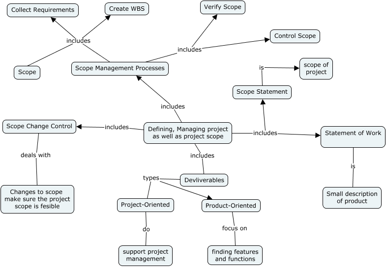 This Concept Map, created with IHMC CmapTools, has information related to: Ch5, Project-Oriented do support project management, Defining, Managing project as well as project scope includes Statement of Work, Devliverables types Project-Oriented, Scope Change Control deals with Changes to scope make sure the project scope is fesible, Scope Management Processes includes Verify Scope, Defining, Managing project as well as project scope includes Devliverables, Scope Management Processes includes Create WBS, Product-Oriented focus on finding features and functions, Scope Statement is scope of project, Defining, Managing project as well as project scope includes Scope Change Control, Scope Management Processes includes Collect Requirements, Defining, Managing project as well as project scope includes Scope Management Processes, Defining, Managing project as well as project scope includes Scope Statement, Statement of Work is Small description of product, Scope Management Processes includes Scope, Scope Management Processes includes Control Scope, Devliverables types Product-Oriented